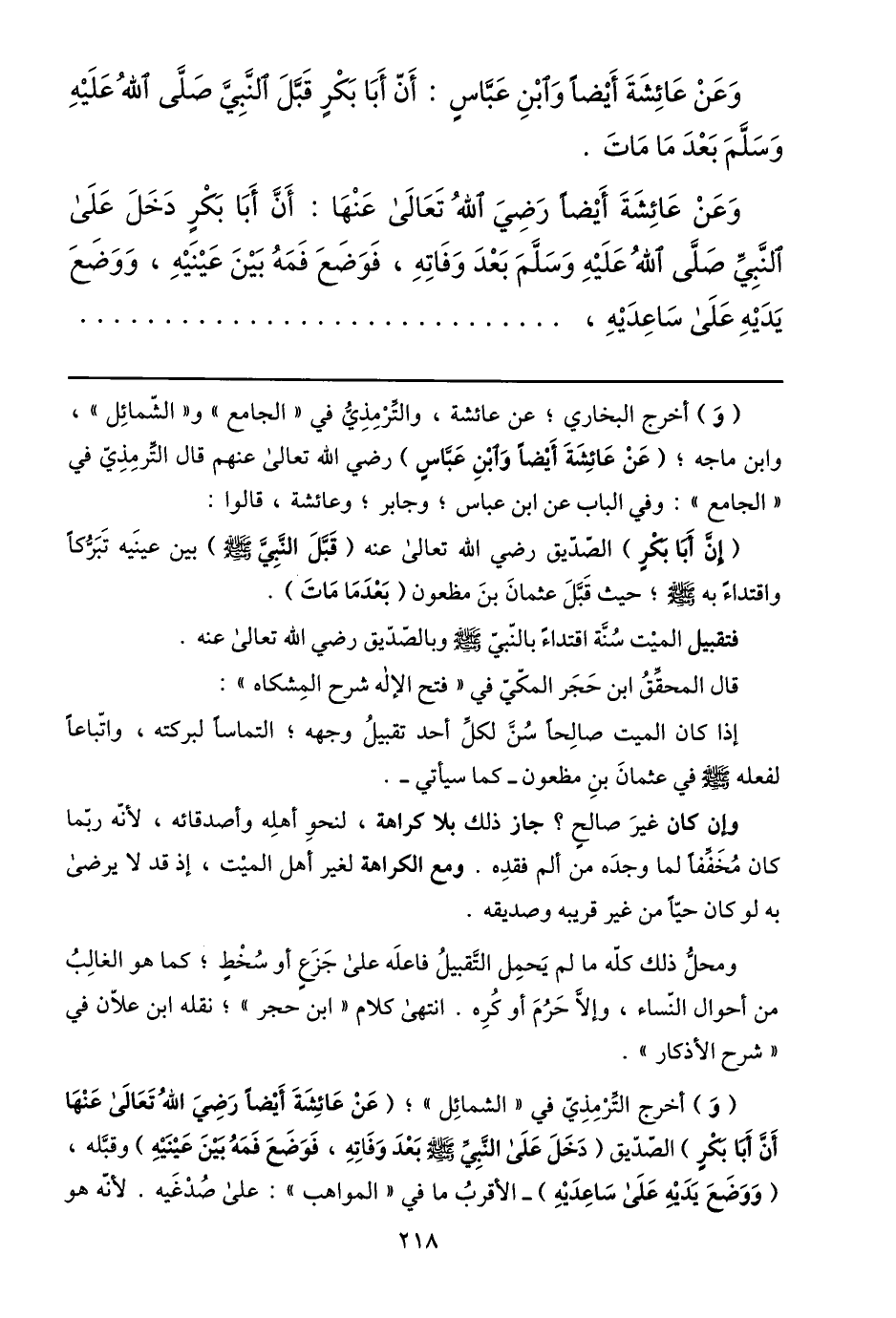 وعن عائشة أيضا وابن عبّاس: أنّ أبا بكر قبّل النّبيّ صلّى الله عليه وسلّم بعد ما مات.