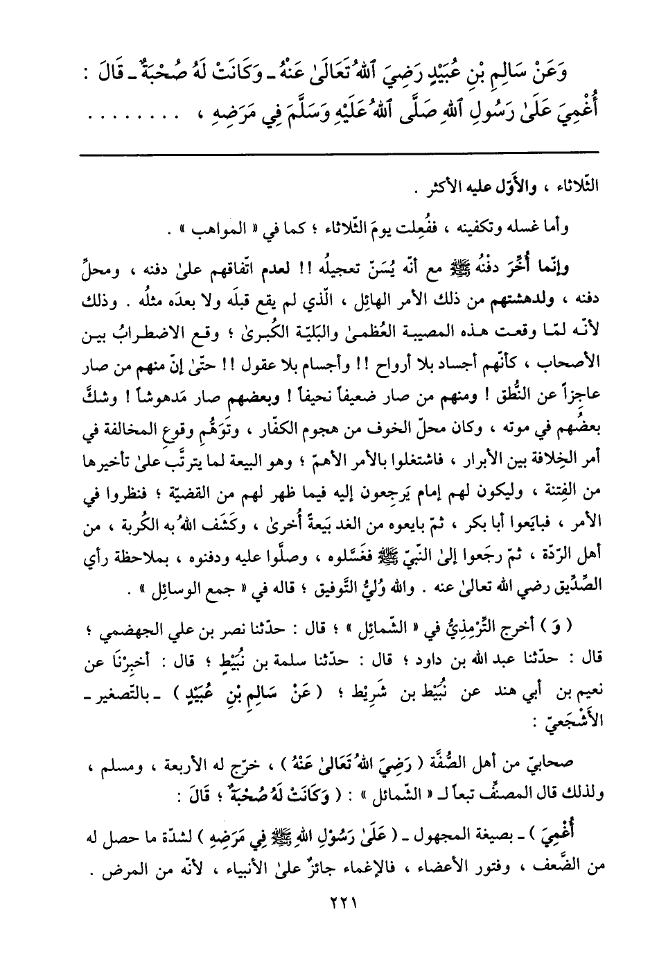 وإنّما أخّر دفنه صلى الله عليه وسلم مع أنّه يسنّ تعجيله!! لعدم اتّفاقهم على دفنه، ومحلّ دفنه، ولدهشتهم من ذلك الأمر الهائل، الّذي لم يقع قبله ولا بعده مثله. وذلك لأنّه لمّا وقعت هذه المصيبة العظمى والبليّة الكبرى؛ وقع الاضطراب بين الأصحاب، كأنّهم أجساد بلا أرواح!! وأجسام بلا عقول!! حتّى إنّ منهم من صار عاجزا عن النّطق! ومنهم من صار ضعيفا نحيفا! وبعضهم صار مدهوشا! وشكّ بعضهم في موته، وكان محلّ الخوف من هجوم الكفّار، وتوهّم وقوع المخالفة في أمر الخلافة بين الأبرار، فاشتغلوا بالأمر الأهمّ؛ وهو البيعة لما يترتّب على تأخيرها من الفتنة، وليكون لهم إمام يرجعون إليه فيما ظهر لهم من القضيّة؛ فنظروا في الأمر، فبايعوا أبا بكر، ثمّ بايعوه من الغد بيعة أخرى، وكشف الله به الكربة، من أهل الرّدّة، ثمّ رجعوا إلى النّبيّ صلى الله عليه وسلم فغسّلوه، وصلّوا عليه ودفنوه، بملاحظة رأي الصّدّيق رضي الله تعالى عنه. والله وليّ التّوفيق؛ قاله في «جمع الوسائل» .