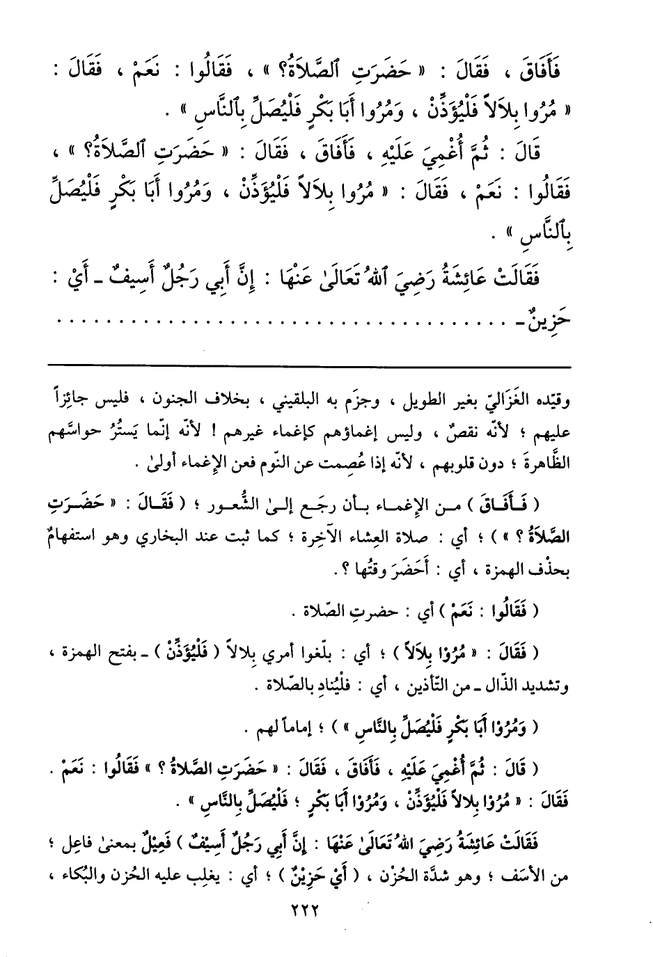 قال: ثمّ أغمي عليه، فأفاق، فقال: «حضرت الصّلاة؟» ، فقالوا: نعم، فقال: «مروا بلالا فليؤذّن، ومروا أبا بكر فليصلّ بالنّاس» .