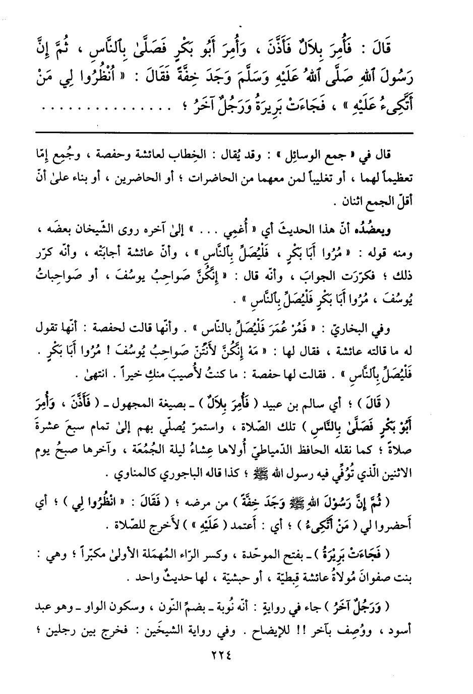 وفي البخاريّ: «فمر عمر فليصلّ بالنّاس» . وأنّها قالت لحفصة: أنّها تقول له ما قالته عائشة، فقال لها: «مه إنّكنّ لأنتنّ صواحب يوسف! مروا أبا بكر.