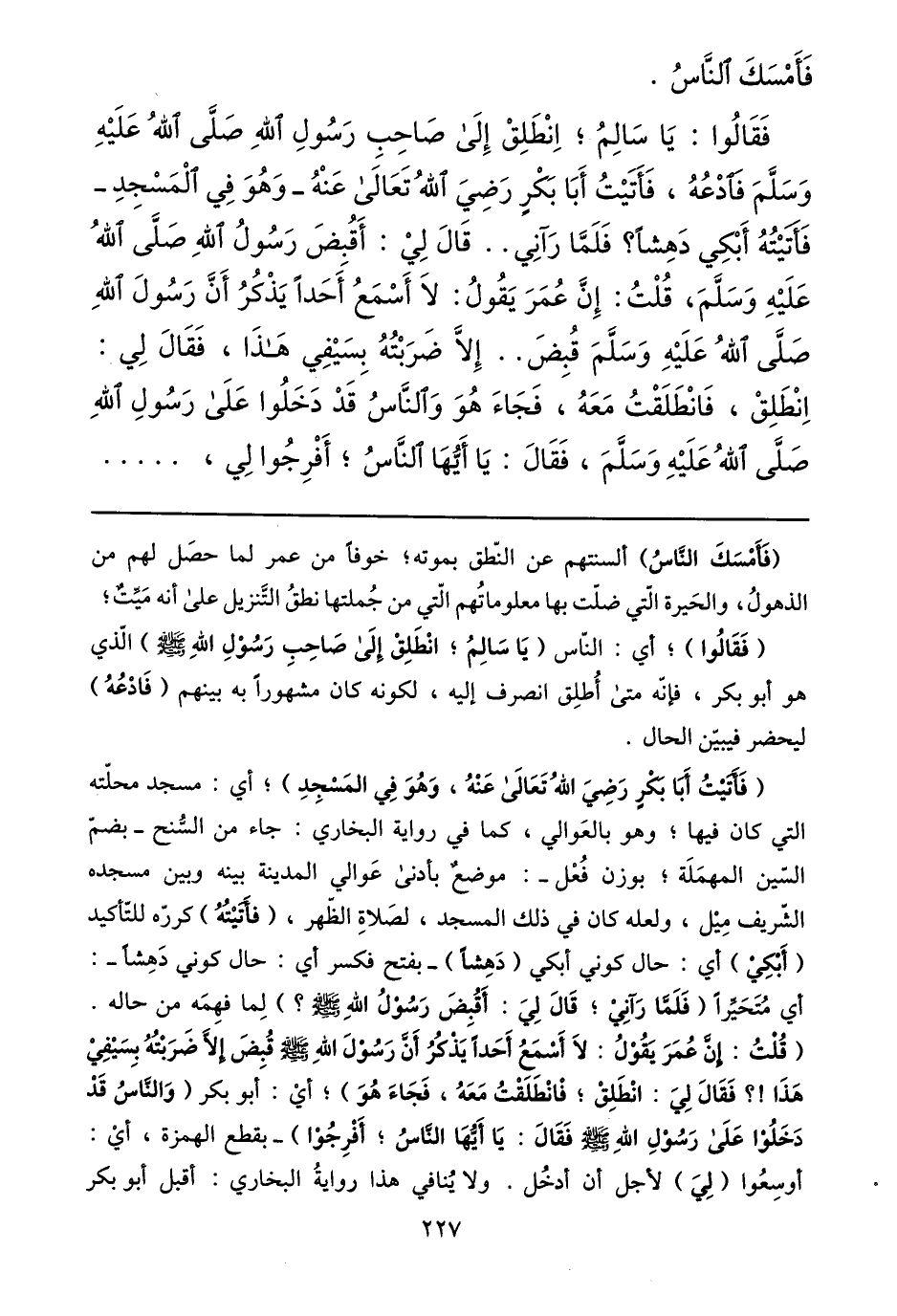 فقالوا: يا سالم؛ انطلق إلى صاحب رسول الله صلّى الله عليه وسلّم فادعه، فأتيت أبا بكر رضي الله تعالى عنه- وهو في المسجد- فأتيته أبكي دهشا؟ فلمّا رآني.. قال لي: أقبض رسول الله صلّى الله عليه وسلّم، قلت: إنّ عمر يقول: لا أسمع أحدا يذكر أنّ رسول الله صلّى الله عليه وسلّم قبض.. إلّا ضربته بسيفي هذا، فقال لي: