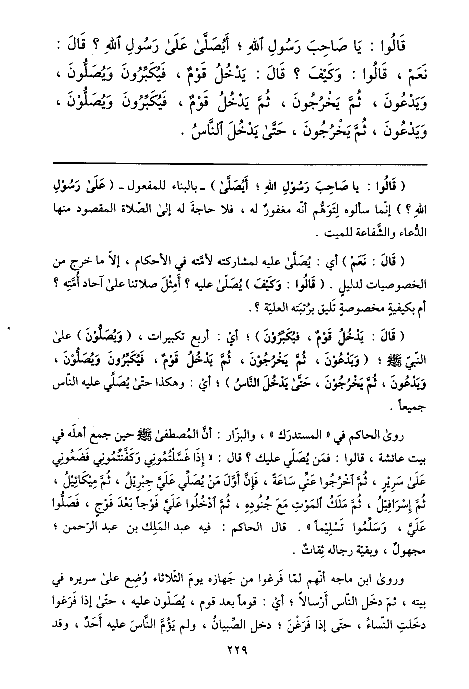 روى الحاكم في «المستدرك» ، والبزّار: أنّ المصطفى صلى الله عليه وسلم حين جمع أهله في بيت عائشة، قالوا: فمن يصلّي عليك؟ قال: «إذا غسّلتموني وكفّنتموني فضعوني على سرير، ثمّ اخرجوا عنّي ساعة، فإنّ أوّل من يصلّي عليّ جبريل، ثمّ ميكائيل، ثمّ إسرافيل، ثمّ ملك الموت مع جنوده، ثمّ ادخلوا عليّ فوجا بعد فوج، فصلّوا عليّ، وسلّموا تسليما» . قال الحاكم: فيه عبد الملك بن عبد الرّحمن؛ مجهول، وبقيّة رجاله ثقات.
