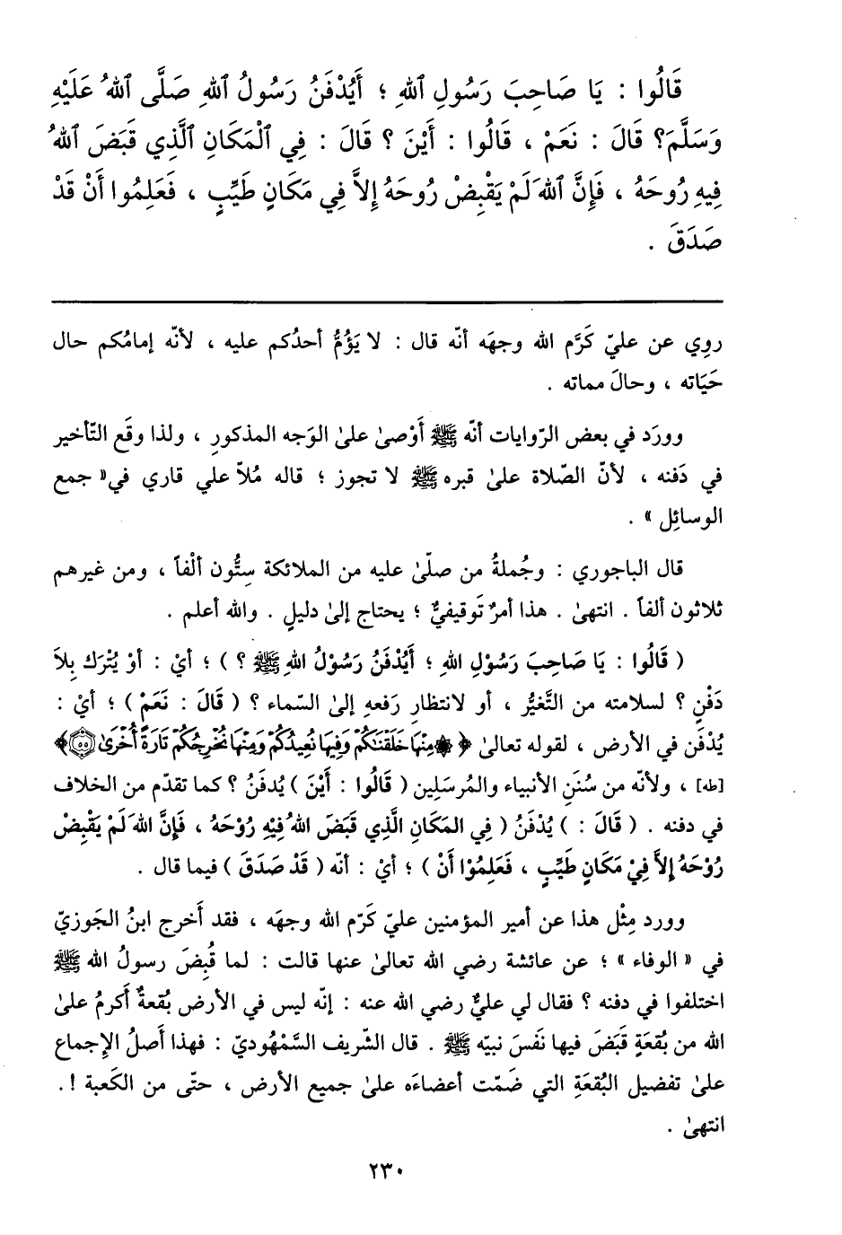 وورد مثل هذا عن أمير المؤمنين عليّ كرّم الله وجهه، فقد أخرج ابن الجوزيّ في «الوفاء» ؛ عن عائشة رضي الله تعالى عنها قالت: لما قبض رسول الله صلى الله عليه وسلم اختلفوا في دفنه؟ فقال لي عليّ رضي الله عنه: إنّه ليس في الأرض بقعة أكرم على الله من بقعة قبض فيها نفس نبيّه صلى الله عليه وسلم. قال الشّريف السّمهوديّ: فهذا أصل الإجماع على تفضيل البقعة التي ضمّت أعضاءه على جميع الأرض، حتّى من الكعبة!.
