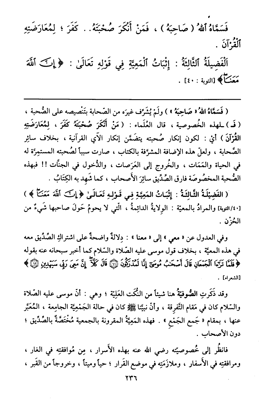 (فسمّاه الله «صاحبه» ) ولم يشرّف غيره من الصّحابة بتنصيصه على الصّحبة، (ف) لهذه الخصوصية، قال العلماء: (من أنكر صحبته كفر، لمعارضته القرآن) أي: لكون إنكار صحبته يتضمّن إنكار الآي القرآنية، بخلاف سائر الصّحابة، ولعلّ هذه الإضافة المشرّفة بالكتاب، صارت سببا لصحبته المستمرّة له في الحياة والممات، والخروج إلى العرصات، والدّخول في الجنّات!! فبهذه الصّحبة المخصوصة فارق الصّدّيق سائر الأصحاب، كما شهد به الكتاب.