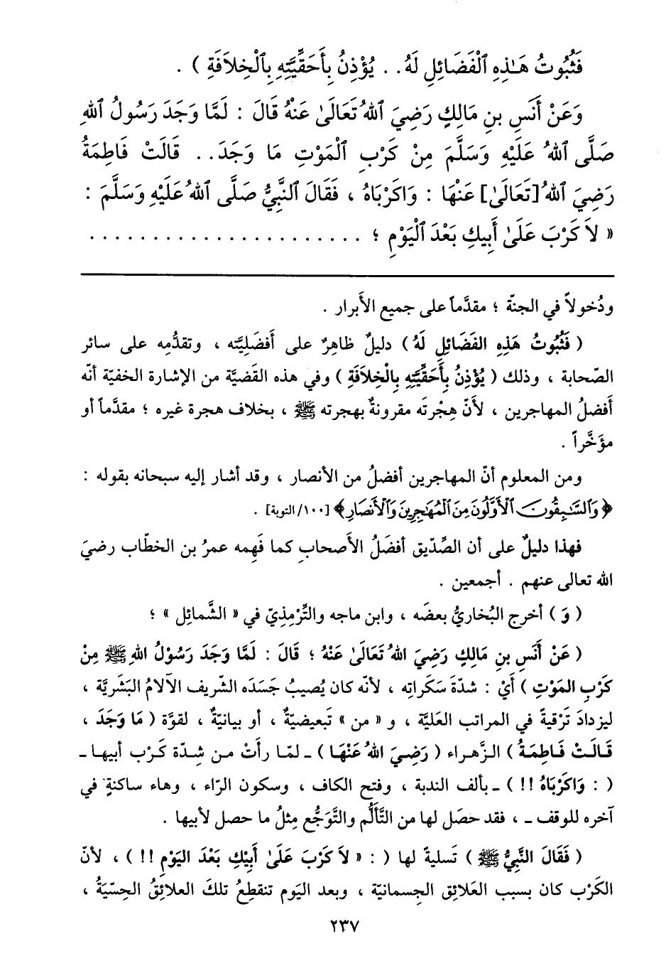 وعن أنس بن مالك رضي الله تعالى عنه قال: لمّا وجد رسول الله صلّى الله عليه وسلّم من كرب الموت ما وجد.. قالت فاطمة رضي الله [تعالى] عنها: واكرباه، فقال النّبيّ صلّى الله عليه وسلّم: