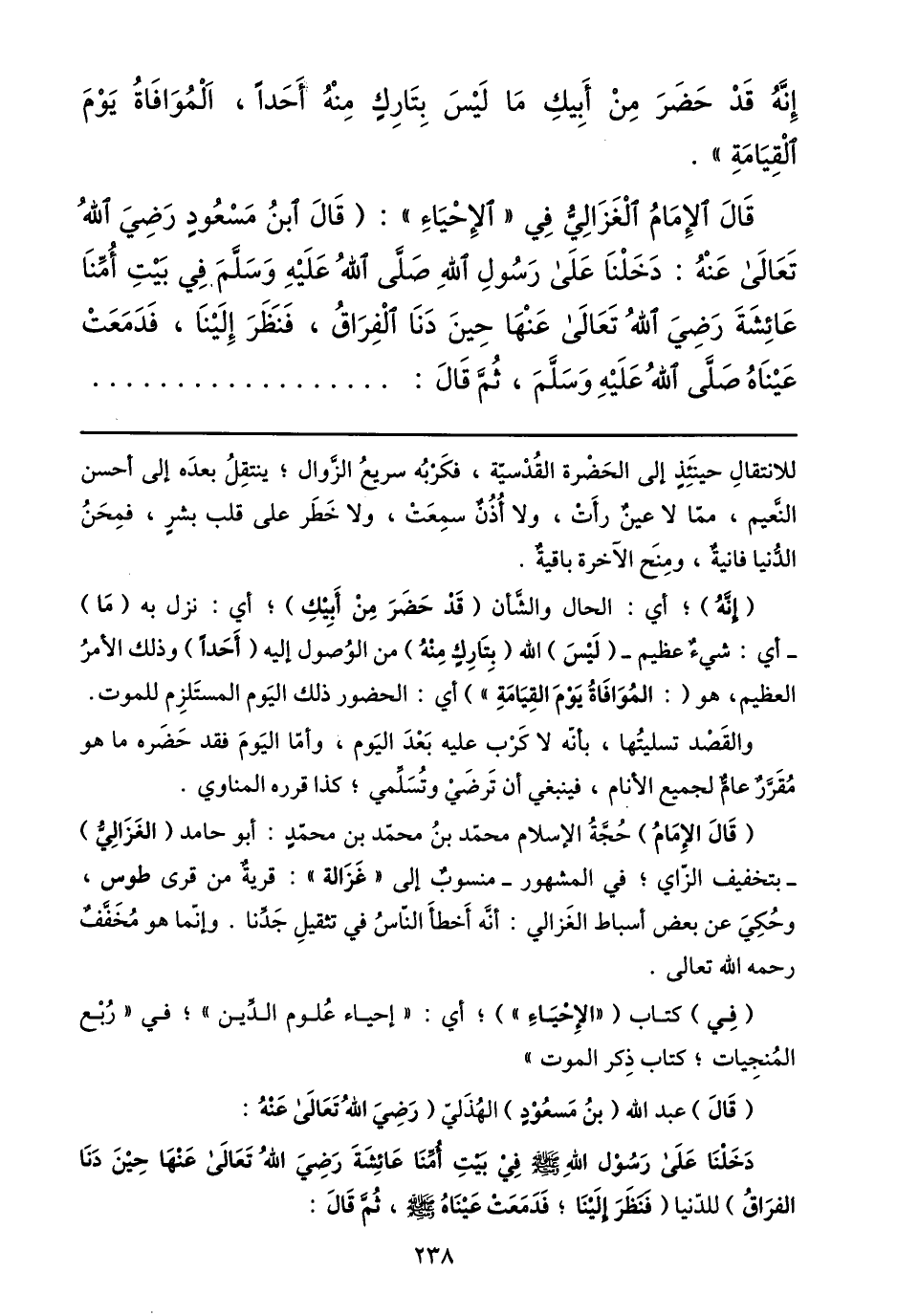 قال الإمام الغزاليّ في «الإحياء» : (قال ابن مسعود رضي الله تعالى عنه: دخلنا على رسول الله صلّى الله عليه وسلّم في بيت أمّنا عائشة رضي الله تعالى عنها حين دنا الفراق، فنظر إلينا، فدمعت عيناه صلّى الله عليه وسلّم، ثمّ قال: ...