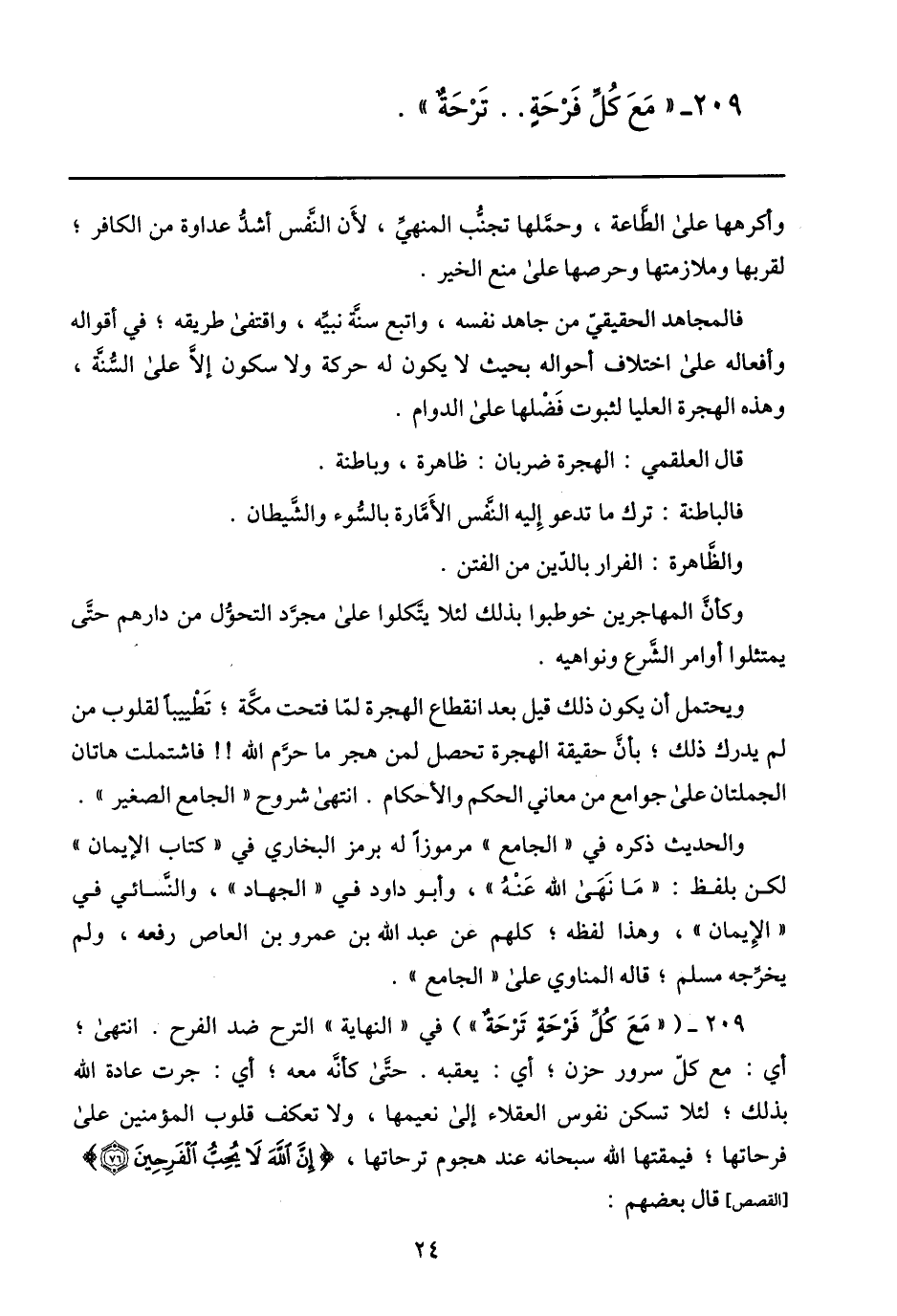 209- ( «مع كلّ فرحة ترحة» ) في «النهاية» الترح ضد الفرح. انتهى؛ أي: مع كلّ سرور حزن؛ أي: يعقبه. حتّى كأنّه معه؛ أي: جرت عادة الله بذلك؛ لئلا تسكن نفوس العقلاء إلى نعيمها، ولا تعكف قلوب المؤمنين على فرحاتها؛ فيمقتها الله سبحانه عند هجوم ترحاتها، إِنَّ اللَّهَ لا يُحِبُّ الْفَرِحِينَ (76) [القصص] قال بعضهم: