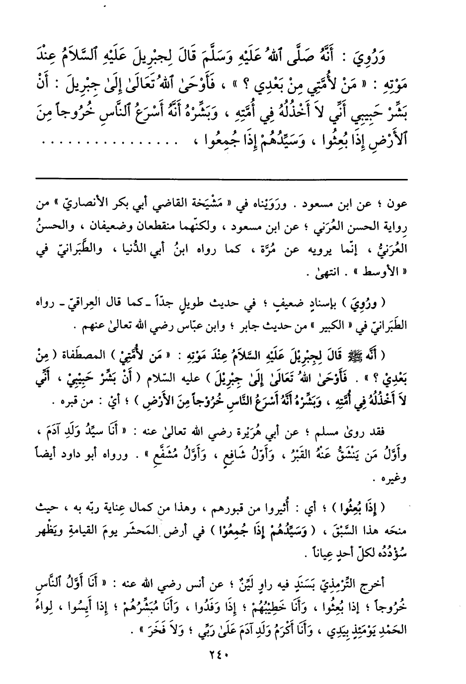 وروي: أنّه صلّى الله عليه وسلّم قال لجبريل عليه السّلام عند موته: «من لأمّتي من بعدي؟» ، فأوحى الله تعالى إلى جبريل: أن بشّر حبيبي أنّي لا أخذله في أمّته، وبشّره أنّه أسرع النّاس خروجا من الأرض إذا بعثوا، وسيّدهم إذا جمعوا، ...