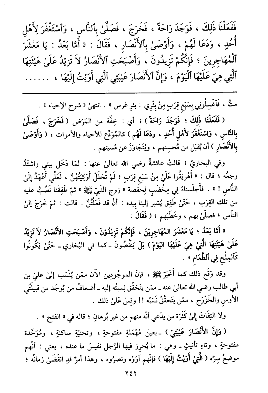 ففعلنا ذلك، فوجد راحة، فخرج، فصلّى بالنّاس، واستغفر لأهل أحد، ودعا لهم، وأوصى بالأنصار، فقال: «أمّا بعد: يا معشر المهاجرين؛ فإنّكم تزيدون، وأصبحت الأنصار لا تزيد على هيئتها الّتي هي عليها اليوم، وإنّ الأنصار عيبتي الّتي أويت إليها، ...