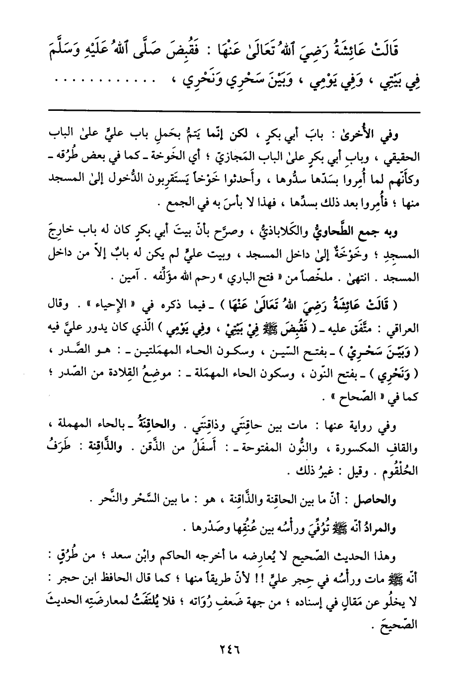 قالت عائشة رضي الله تعالى عنها: فقبض صلّى الله عليه وسلّم في بيتي، وفي يومي، وبين سحري ونحري، ...