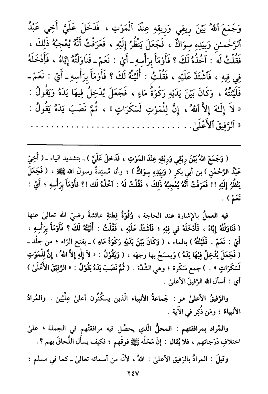 فيه العمل بالإشارة عند الحاجة، وقوّة فطنة عائشة رضي الله تعالى عنها (فناولته إيّاه، فأدخله في فيه؛ فاشتدّ عليه، فقلت: أليّنه لك؟ فأومأ برأسه، أي: نعم. فليّنته) بالماء، (وكان بين يديه ركوة ماء) - بفتح الرّاء؛ من جلد- (فجعل يدخل فيها يده) ويمسح بها وجهه، (ويقول: «لا إله إلّا الله، إنّ للموت لسكرات» .) جمع سكرة؛ وهي الشّدّة. (ثمّ نصب يده يقول: «الرّفيق الأعلى) أي: أسأل الله الرّفيق الأعلى.