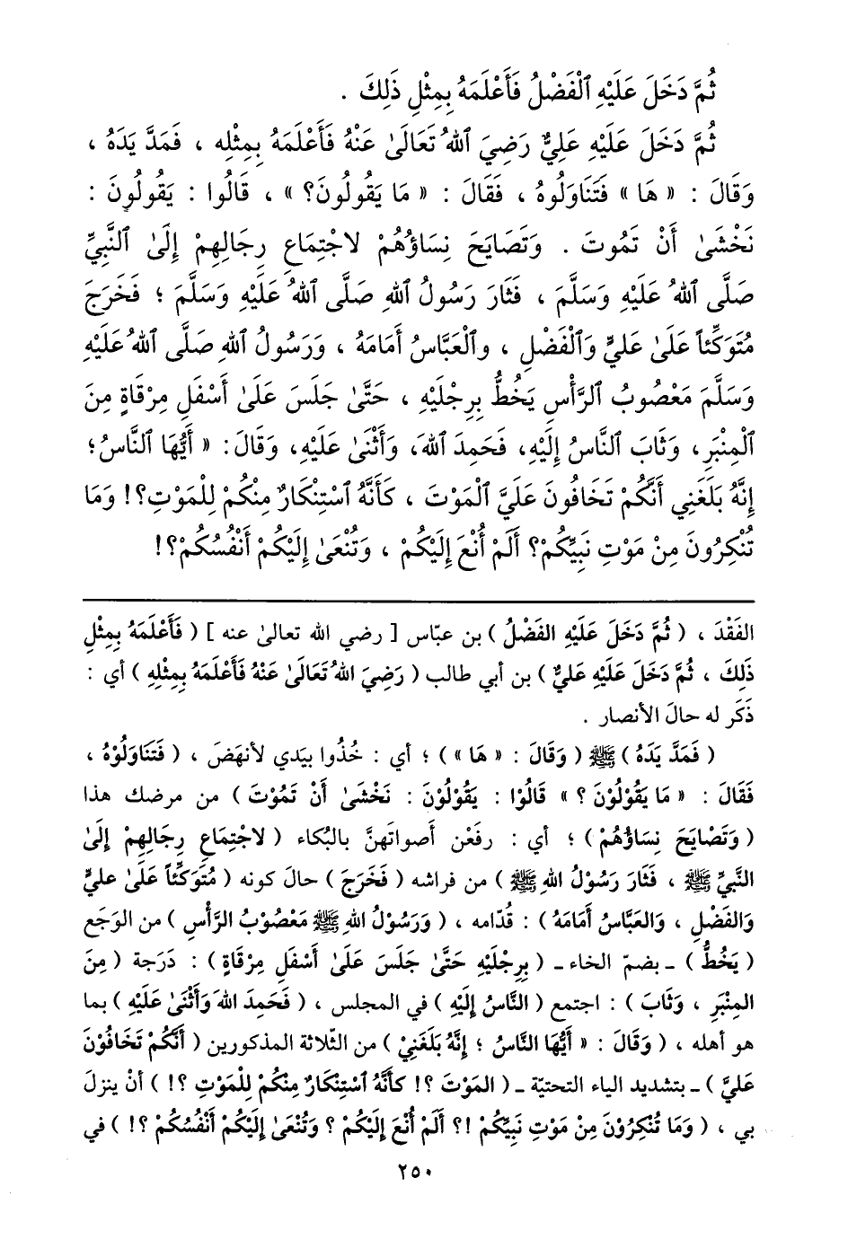 نخشى أن تموت. وتصايح نساؤهم لاجتماع رجالهم إلى النّبيّ صلّى الله عليه وسلّم، فثار رسول الله صلّى الله عليه وسلّم؛ فخرج متوكّئا على عليّ والفضل، والعبّاس أمامه، ورسول الله صلّى الله عليه وسلّم معصوب الرّأس يخطّ برجليه، حتّى جلس على أسفل مرقاة من المنبر، وثاب النّاس إليه، فحمد الله، وأثنى عليه، وقال: «أيّها النّاس؛ إنّه بلغني أنّكم تخافون عليّ الموت، كأنّه استنكار منكم للموت؟! وما تنكرون من موت نبيّكم؟ ألم أنع إليكم، وتنعى إليكم أنفسكم؟!
