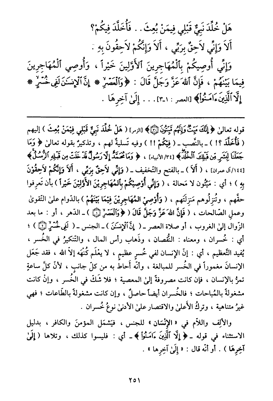 قوله تعالى إِنَّكَ مَيِّتٌ وَإِنَّهُمْ مَيِّتُونَ (30) [الزمر] (هل خلّد نبيّ قبلي فيمن بعث) إليهم (فأخلّد؟!) - بالنّصب- (فيكم!!) وفيه تسلية لهم، وتذكير بقوله تعالى وَما جَعَلْنا لِبَشَرٍ مِنْ قَبْلِكَ الْخُلْدَ [34/ الأنبياء] ، وَما مُحَمَّدٌ إِلَّا رَسُولٌ قَدْ خَلَتْ مِنْ قَبْلِهِ الرُّسُلُ [144/ آل عمران] ، (ألا) - بالفتح والتّخفيف- (وإنّي لاحق بربّي، ألا وإنّكم لاحقون به) ؛ أي: ميّتون لا محالة، (وإنّي أوصيكم بالمهاجرين الأوّلين خيرا) بأن تعرفوا حقّهم، وتنزلوهم منزلتهم، (وأوصي المهاجرين فيما بينهم) بالدّوام على التّقوى وعمل الصّالحات، (فإنّ الله عزّ وجلّ قال (وَالْعَصْرِ) (1) - الدّهر، أو: ما بعد الزّوال إلى الغروب، أو صلاة العصر- (إِنَّ الْإِنْسانَ) - الجنس- (لَفِي خُسْرٍ) (2) ؛ أي: خسران، ومعناه: النّقصان، وذهاب رأس المال، والتّنكير في الخسر، يفيد التّعظيم، أي: إنّ الإنسان لفي خسر عظيم، لا يعلم كنهه إلّا الله، فقد جعل الإنسان مغمورا في الخسر للمبالغة، وأنّه أحاط به من كلّ جانب، لأنّ كلّ ساعة تمرّ بالإنسان، فإن كانت مصروفة إلى المعصية؛ فلا شكّ في الخسر، وإن كانت مشغولة بالمباحات؛ فالخسران أيضا حاصل، وإن كانت مشغولة بالطّاعات؛ فهي غير متناهية، وترك الأعلى والاقتصار على الأدنى نوع خسران.