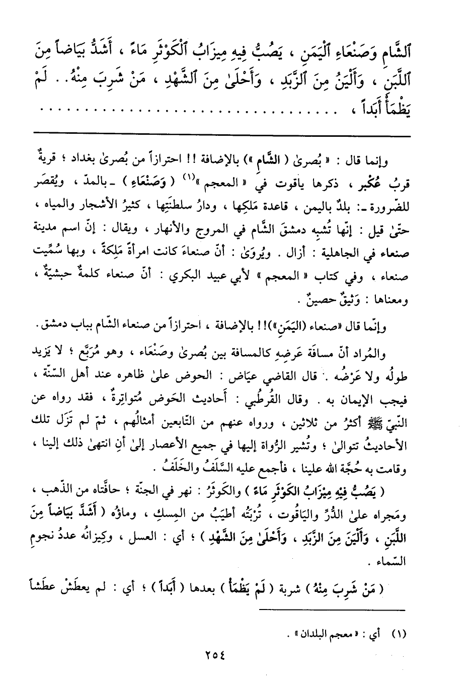 الشّام وصنعاء اليمن، يصبّ فيه ميزاب الكوثر ماء، أشدّ بياضا من اللّبن، وألين من الزّبد، وأحلى من الشّهد، من شرب منه.. لم يظمأ أبدا، ...