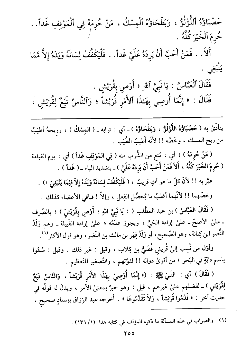 فقال: «إنّما أوصي بهذا الأمر قريشا؛ والنّاس تبع لقريش، يتأذّى به (حصباؤه اللّؤلؤ، وبطحاؤه) - أي: ترابه- (المسك) ، وريحه أطيب من ريح المسك، وخصّه!! لأنّه أطيب الطّيب.
