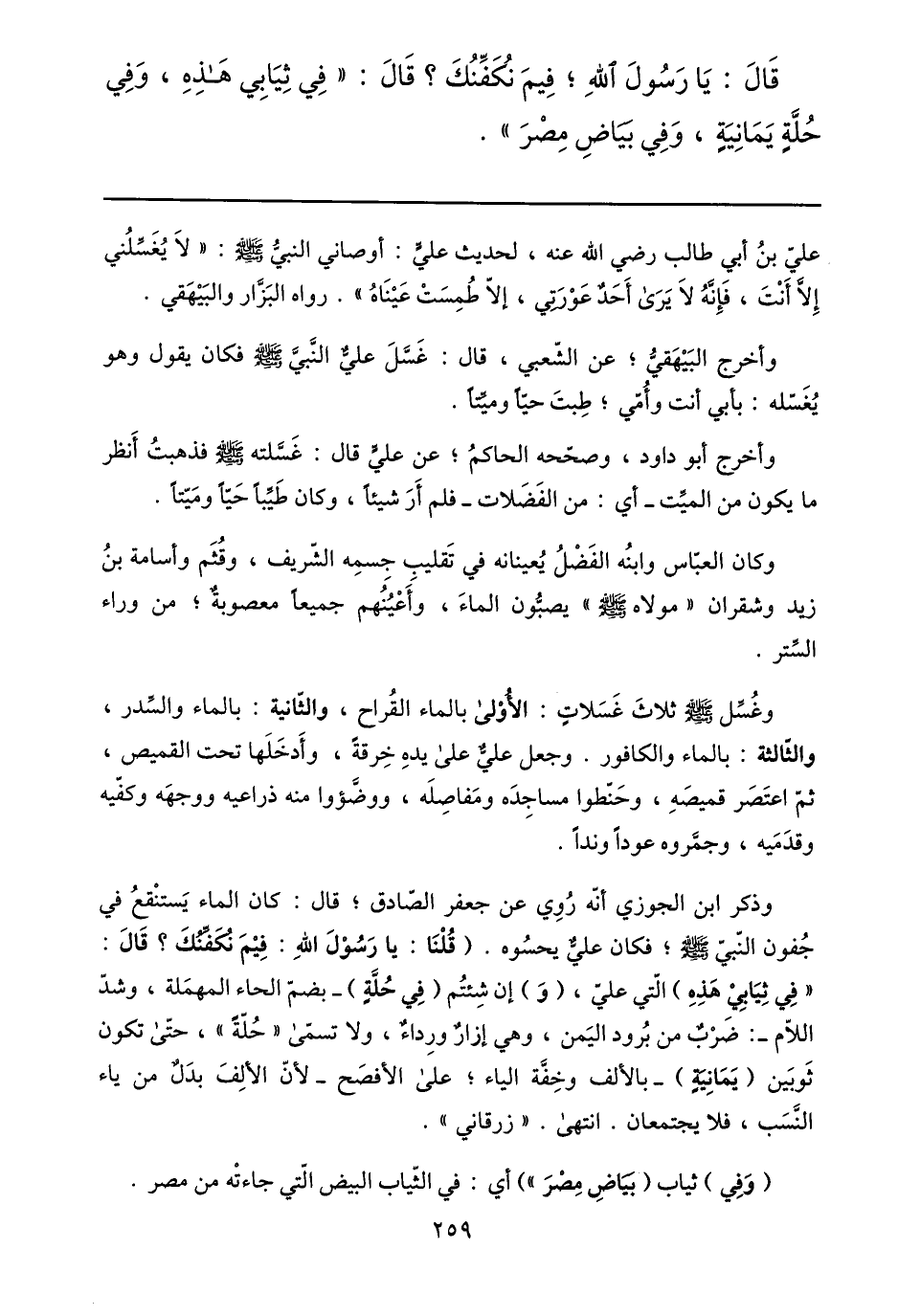 قال: يا رسول الله؛ فيم نكفّنك؟ قال: «في ثيابي هذه، وفي حلّة يمانية، وفي بياض مصر» .