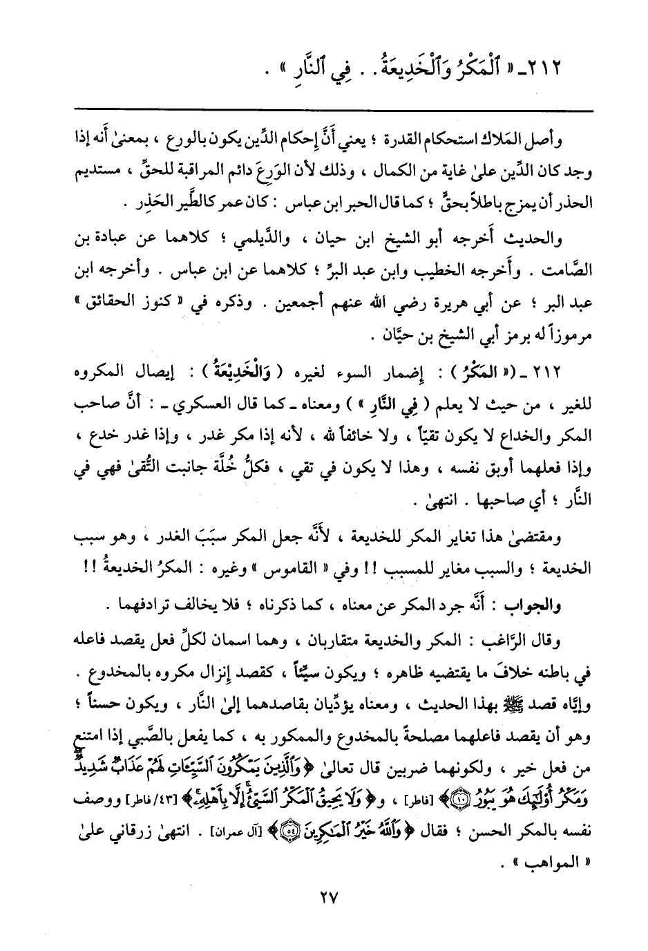 212- ( «المكر) : إضمار السوء لغيره (والخديعة) : إيصال المكروه للغير، من حيث لا يعلم (في النّار» ) ومعناه- كما قال العسكري-: أنّ صاحب المكر والخداع لا يكون تقيّا، ولا خائفا لله، لأنه إذا مكر غدر، وإذا غدر خدع، وإذا فعلهما أوبق نفسه، وهذا لا يكون في تقي، فكلّ خلّة جانبت التّقى فهي في النّار؛ أي صاحبها. انتهى.