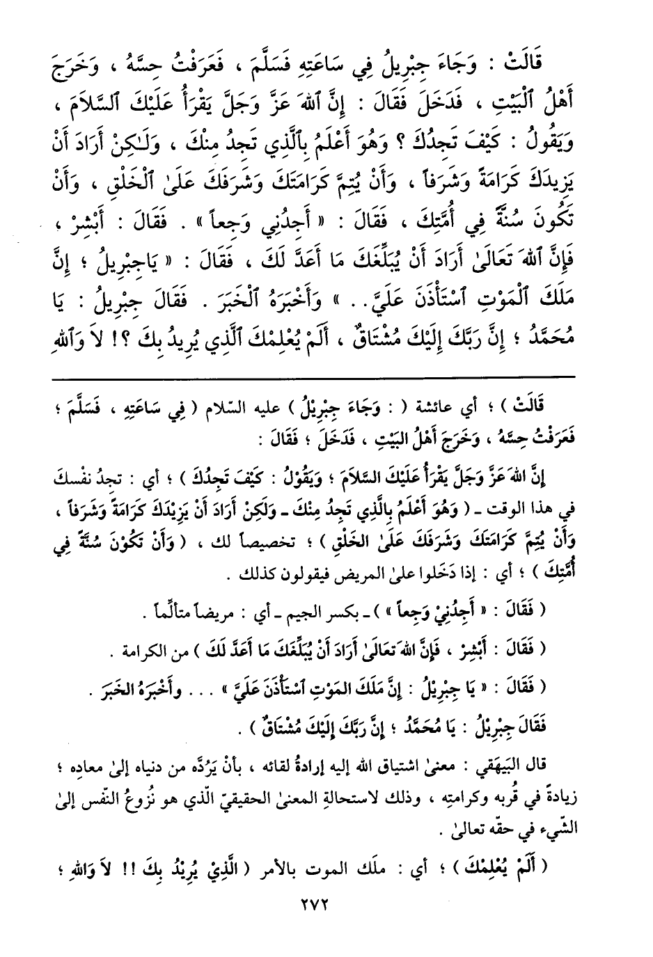 قالت: وجاء جبريل في ساعته فسلّم، فعرفت حسّه، وخرج أهل البيت، فدخل فقال: إنّ الله عزّ وجلّ يقرأ عليك السّلام، ويقول: كيف تجدك؟ وهو أعلم بالّذي تجد منك، ولكن أراد أن يزيدك كرامة وشرفا، وأن يتمّ كرامتك وشرفك على الخلق، وأن تكون سنّة في أمّتك، فقال: «أجدني وجعا» . فقال: أبشر، فإنّ الله تعالى أراد أن يبلّغك ما أعدّ لك، فقال: «يا جبريل؛ إنّ ملك الموت استأذن عليّ..» وأخبره الخبر. فقال جبريل: يا محمّد؛ إنّ ربّك إليك مشتاق، ألم يعلمك الّذي يريد بك؟! لا والله قالت) ؛ أي عائشة (: وجاء جبريل) عليه السّلام (في ساعته، فسلّم؛ فعرفت حسّه، وخرج أهل البيت، فدخل؛ فقال: