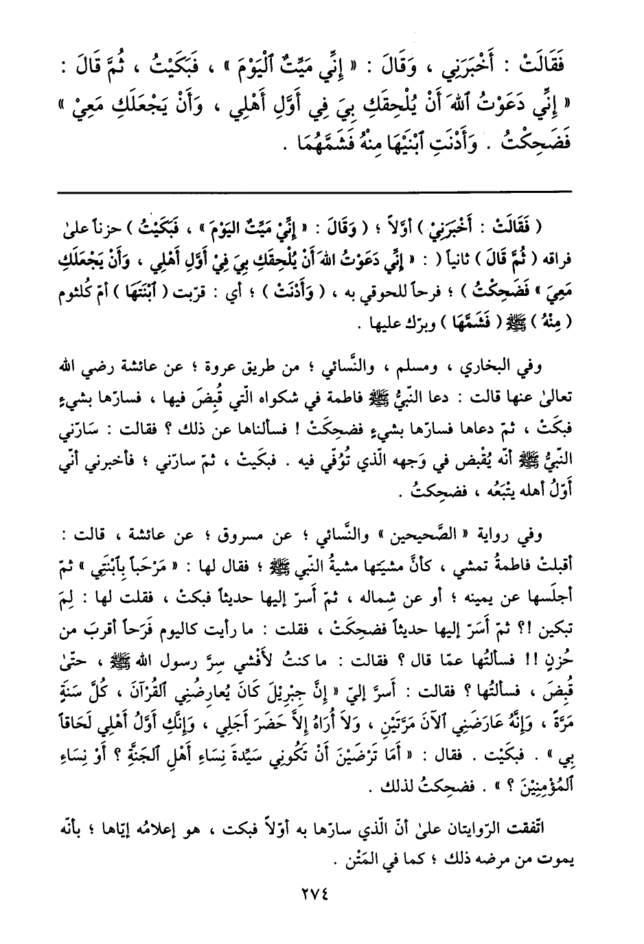 وفي البخاري، ومسلم، والنّسائي؛ من طريق عروة؛ عن عائشة رضي الله تعالى عنها قالت: دعا النّبيّ صلى الله عليه وسلم فاطمة في شكواه الّتي قبض فيها، فسارّها بشيء فبكت، ثمّ دعاها فسارّها بشيء فضحكت! فسألناها عن ذلك؟ فقالت: سارّني النّبيّ صلى الله عليه وسلم أنّه يقبض في وجهه الّذي توفّي فيه. فبكيت، ثمّ سارّني؛ فأخبرني أنّي أوّل أهله يتبعه، فضحكت.