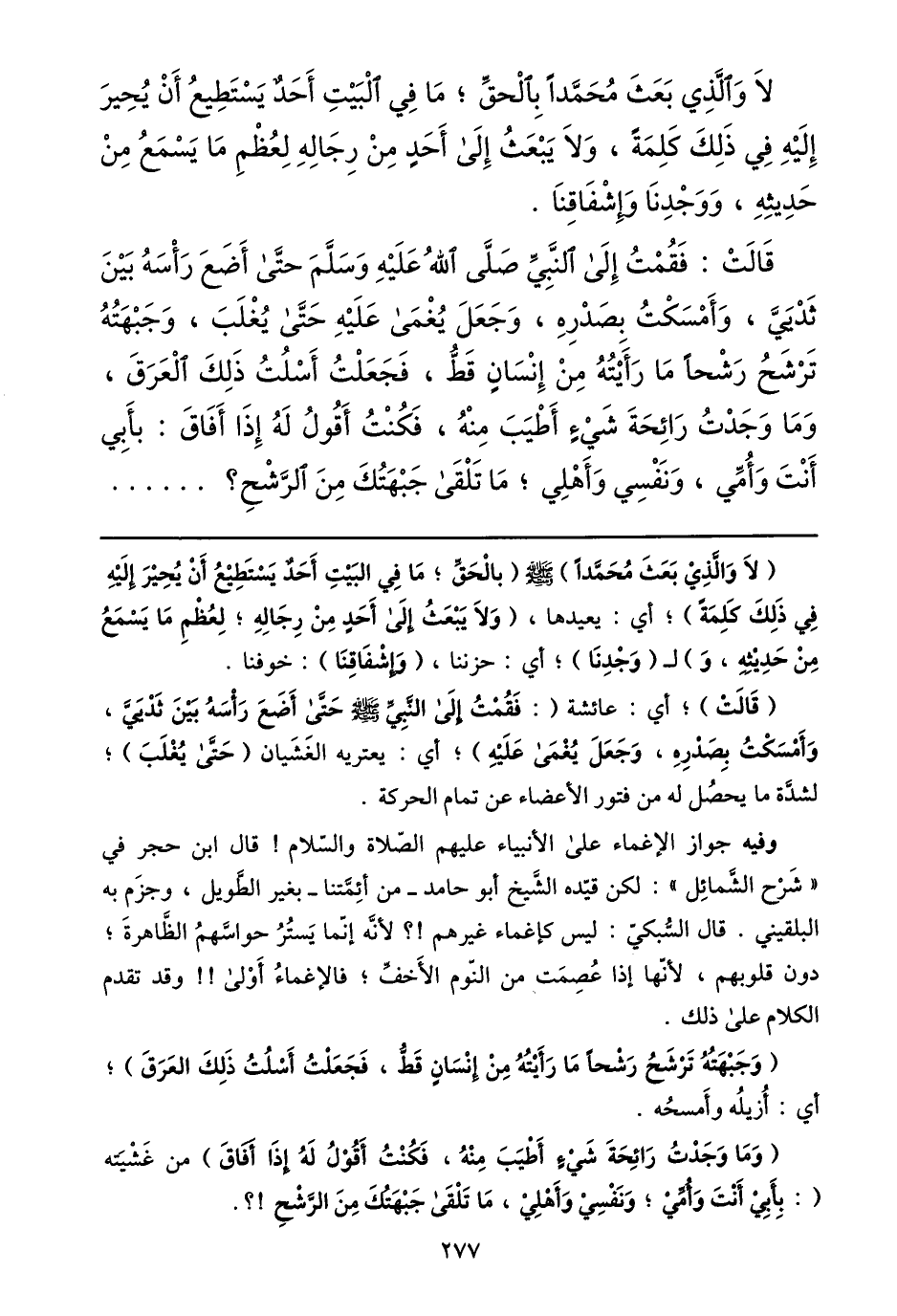 قالت: فقمت إلى النّبيّ صلّى الله عليه وسلّم حتّى أضع رأسه بين ثدييّ، وأمسكت بصدره، وجعل يغمى عليه حتّى يغلب، وجبهته ترشح رشحا ما رأيته من إنسان قطّ، فجعلت أسلت ذلك العرق، وما وجدت رائحة شيء أطيب منه، فكنت أقول له إذا أفاق: بأبي أنت وأمّي، ونفسي وأهلي؛ ما تلقى جبهتك من الرّشح؟ ...