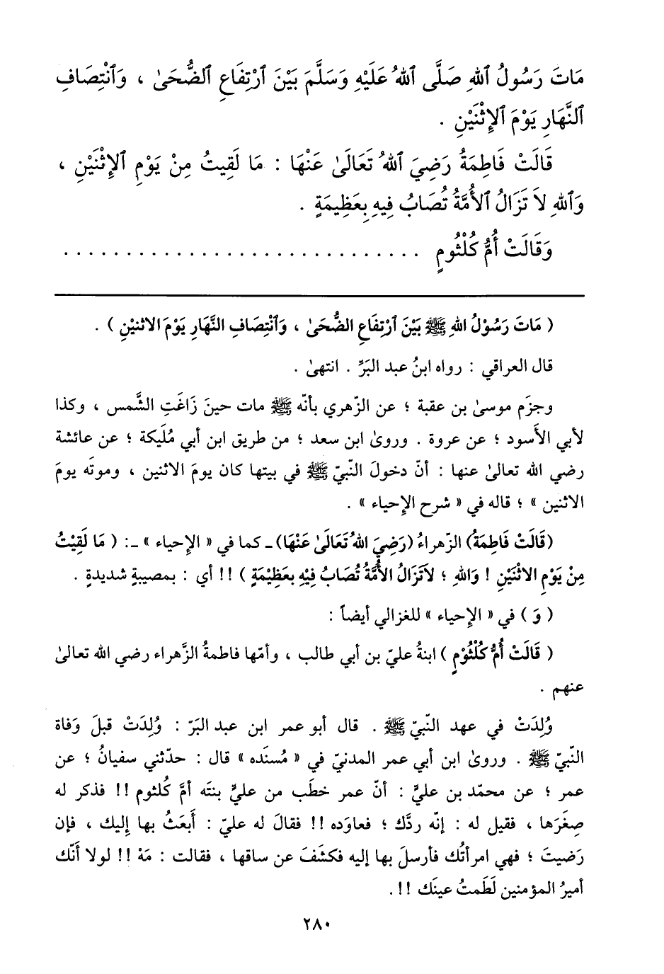 (مات رسول الله صلى الله عليه وسلم بين ارتفاع الضّحى، وانتصاف النّهار يوم الاثنين) .