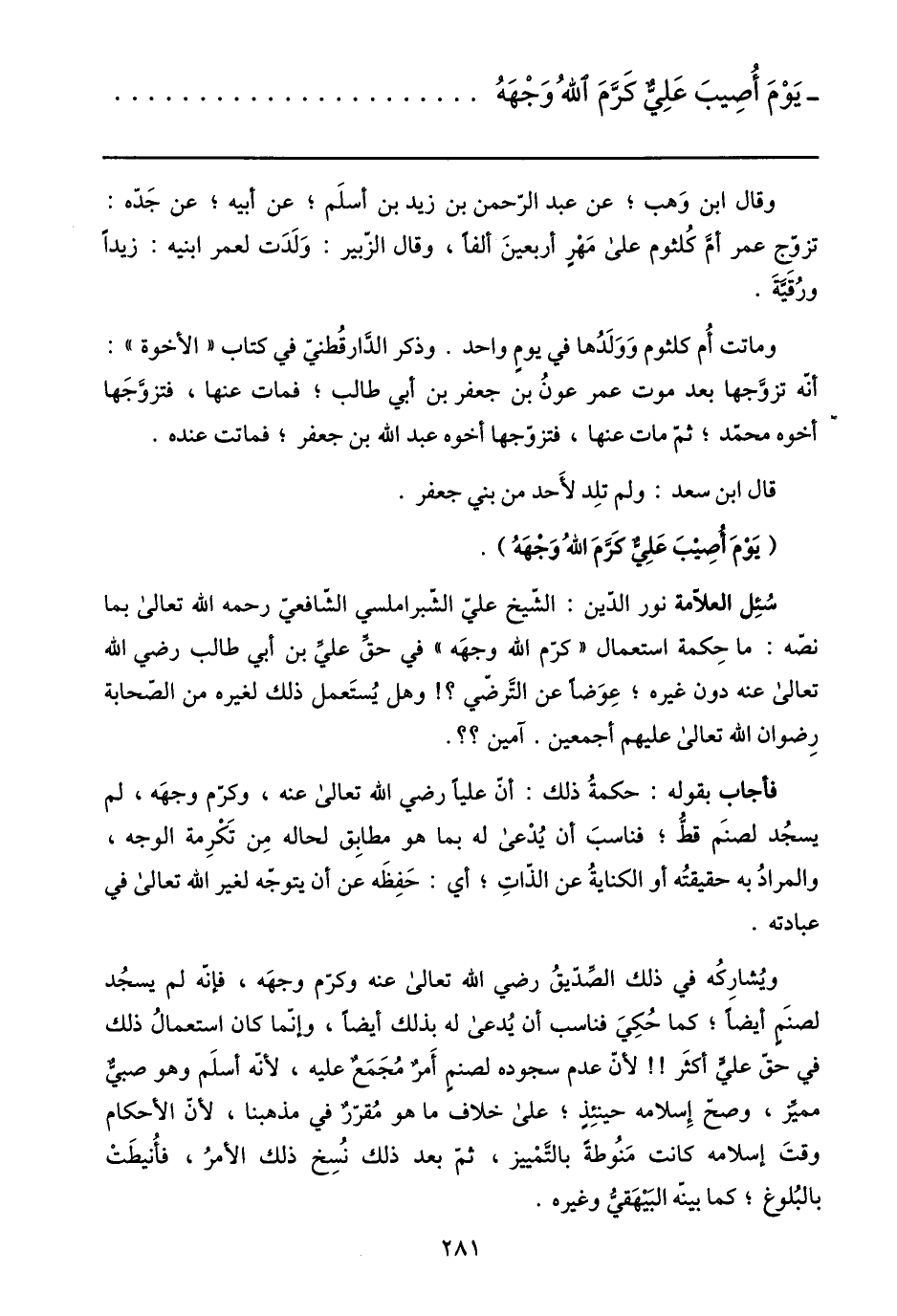 سئل العلّامة نور الدّين: الشّيخ عليّ الشّبراملسي الشّافعيّ رحمه الله تعالى بما نصّه: ما حكمة استعمال «كرّم الله وجهه» في حقّ عليّ بن أبي طالب رضي الله تعالى عنه دون غيره؛ عوضا عن التّرضّي؟! وهل يستعمل ذلك لغيره من الصّحابة رضوان الله تعالى عليهم أجمعين. آمين؟؟.