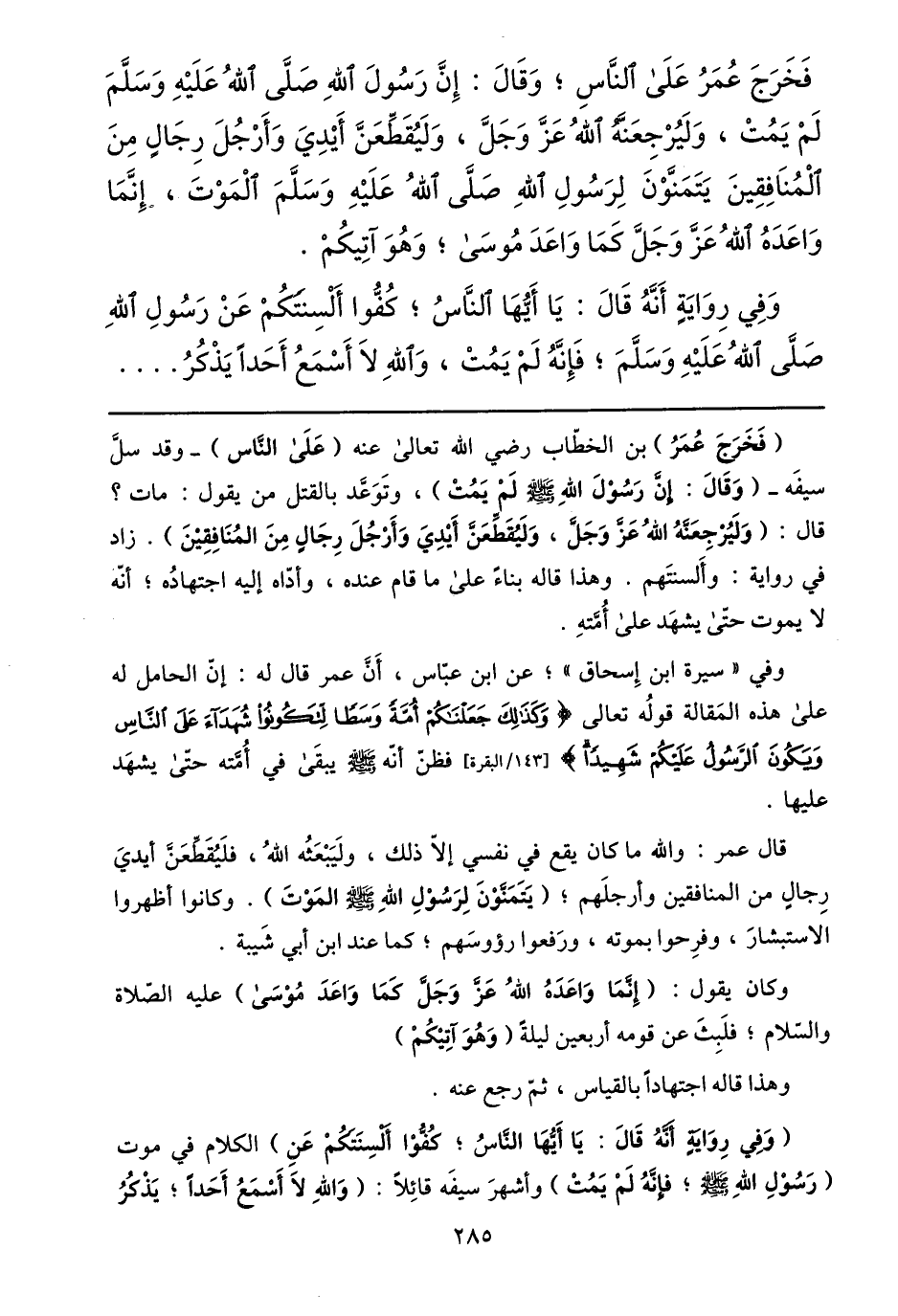 وفي «سيرة ابن إسحاق» ؛ عن ابن عبّاس، أنّ عمر قال له: إنّ الحامل له على هذه المقالة قوله تعالى وَكَذلِكَ جَعَلْناكُمْ أُمَّةً وَسَطاً لِتَكُونُوا شُهَداءَ عَلَى النَّاسِ وَيَكُونَ الرَّسُولُ عَلَيْكُمْ شَهِيداً [143/ البقرة] فظنّ أنّه صلى الله عليه وسلم يبقى في أمّته حتّى يشهد عليها.