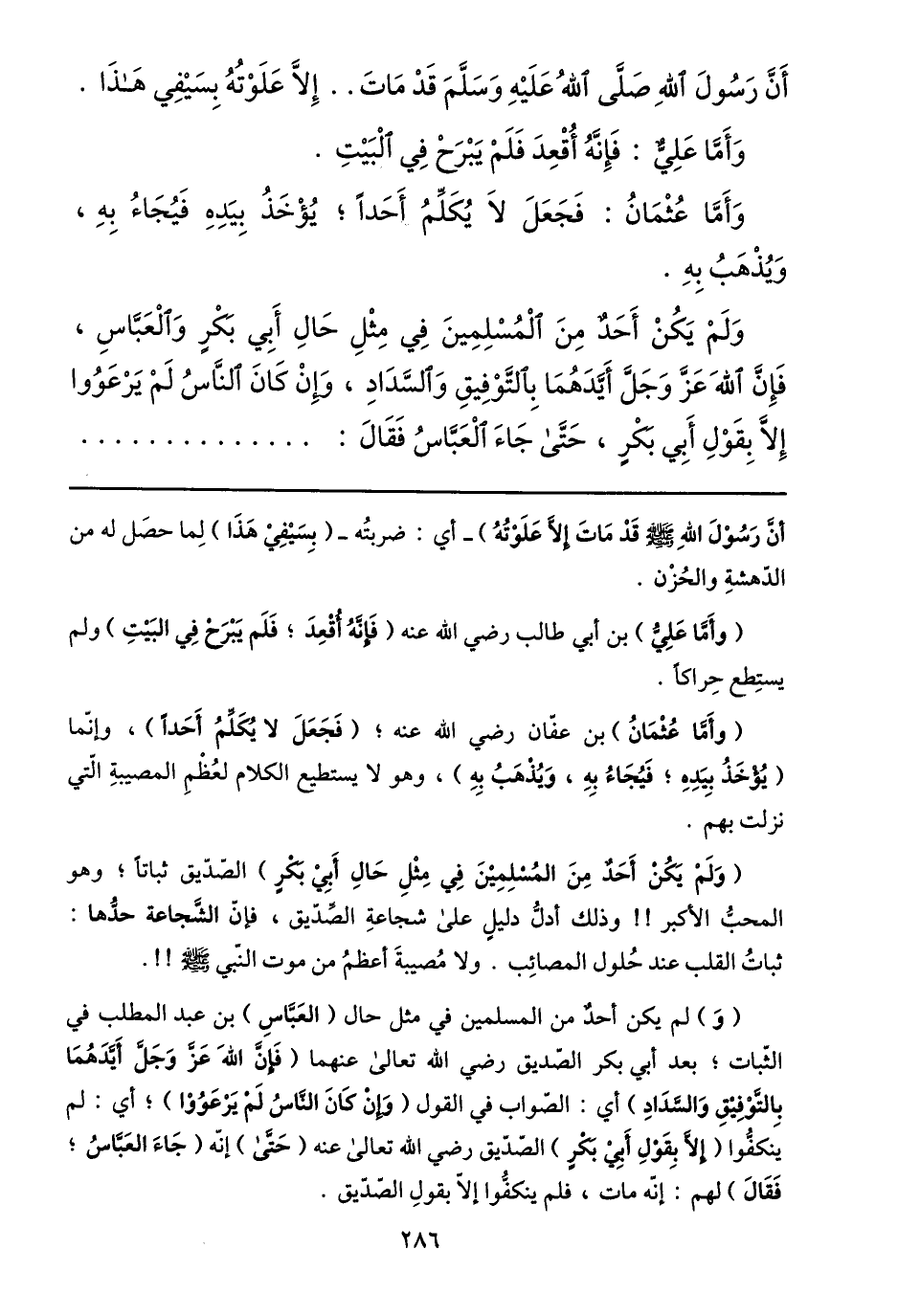 ولم يكن أحد من المسلمين في مثل حال أبي بكر والعبّاس، فإنّ الله عزّ وجلّ أيّدهما بالتّوفيق والسّداد، وإن كان النّاس لم يرعووا إلّا بقول أبي بكر، حتّى جاء العبّاس فقال: ...