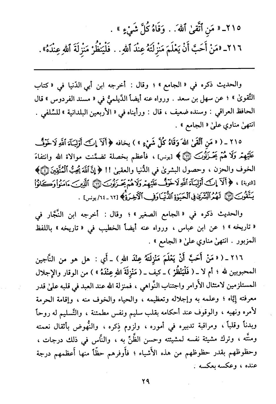 215- ( «من اتّقى الله وقاه كلّ شيء» ) يخافه أَلا إِنَّ أَوْلِياءَ اللَّهِ لا خَوْفٌ عَلَيْهِمْ وَلا هُمْ يَحْزَنُونَ (62) [يونس] ، فأعظم بخصلة تضمّنت موالاة الله وانتفاء الخوف والحزن، وحصول البشرى في الدّنيا والعقبى!! فَإِنَّ اللَّهَ يُحِبُّ الْمُتَّقِينَ (4) [التوبة] ، أَلا إِنَّ أَوْلِياءَ اللَّهِ لا خَوْفٌ عَلَيْهِمْ وَلا هُمْ يَحْزَنُونَ (62) الَّذِينَ آمَنُوا وَكانُوا يَتَّقُونَ (63) لَهُمُ الْبُشْرى فِي الْحَياةِ الدُّنْيا وَفِي الْآخِرَةِ [62- 64/ يونس] .
