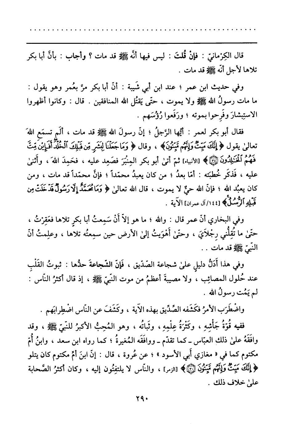 فقال أبو بكر لعمر: أيّها الرّجل؛ إنّ رسول الله صلى الله عليه وسلم قد مات، ألم تسمع الله تعالى يقول إِنَّكَ مَيِّتٌ وَإِنَّهُمْ مَيِّتُونَ، وقال وَما جَعَلْنا لِبَشَرٍ مِنْ قَبْلِكَ الْخُلْدَ أَفَإِنْ مِتَّ فَهُمُ الْخالِدُونَ (34) [الأنبياء] ثمّ أتى أبو بكر المنبر فصعد عليه، فحمد الله، وأثنى عليه، فذكر خطبته: أمّا بعد؛ من كان يعبد محمّدا؛ فإنّ محمّدا قد مات، ومن كان يعبد الله؛ فإنّ الله حيّ لا يموت، قال الله تعالى وَما مُحَمَّدٌ إِلَّا رَسُولٌ قَدْ خَلَتْ مِنْ قَبْلِهِ الرُّسُلُ [144/ آل عمران] الآية.