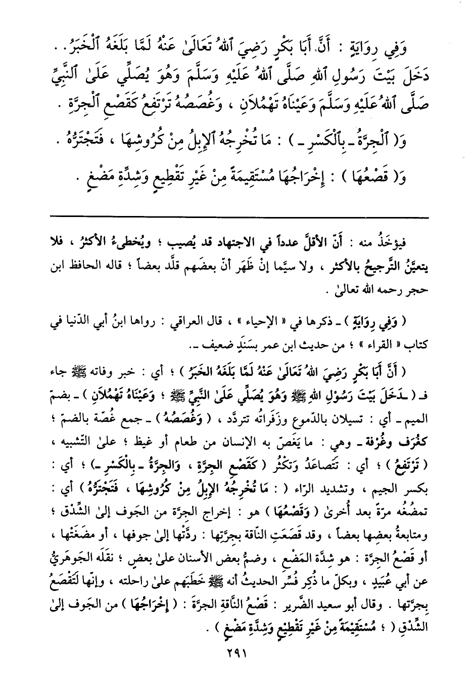 (أنّ أبا بكر رضي الله تعالى عنه لمّا بلغه الخبر) ؛ أي: خبر وفاته صلى الله عليه وسلم جاء ف (دخل بيت رسول الله صلى الله عليه وسلم وهو يصلّي على النّبيّ صلى الله عليه وسلم؛ وعيناه تهملان) - بضمّ الميم- أي: تسيلان بالدّموع وزفراته تتردّد، (وغصصه) - جمع غصّة بالضمّ؛ كغرف وغرفة- وهي: ما يغصّ به الإنسان من طعام أو غيظ؛ على التّشبيه، (ترتفع) ؛ أي: تتصاعد وتكثر (كقصع الجرّة، والجرّة- بالكسر-) ؛ أي:
