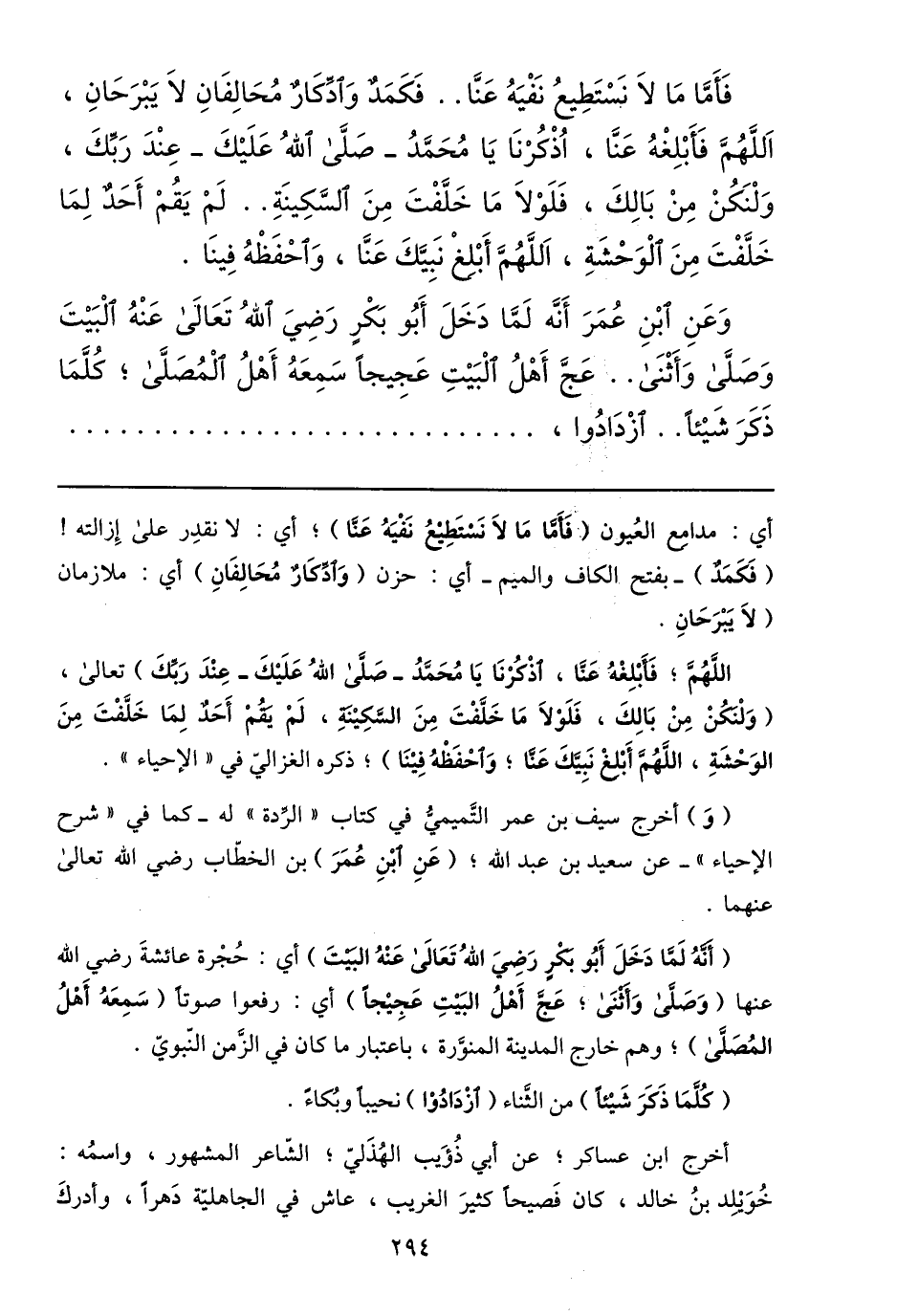 فأمّا ما لا نستطيع نفيه عنّا.. فكمد وادّكار محالفان لا يبرحان، اللهمّ فأبلغه عنّا، اذكرنا يا محمّد- صلّى الله عليك- عند ربّك، ولنكن من بالك، فلولا ما خلّفت من السّكينة.. لم يقم أحد لما خلّفت من الوحشة، اللهمّ أبلغ نبيّك عنّا، واحفظه فينا.