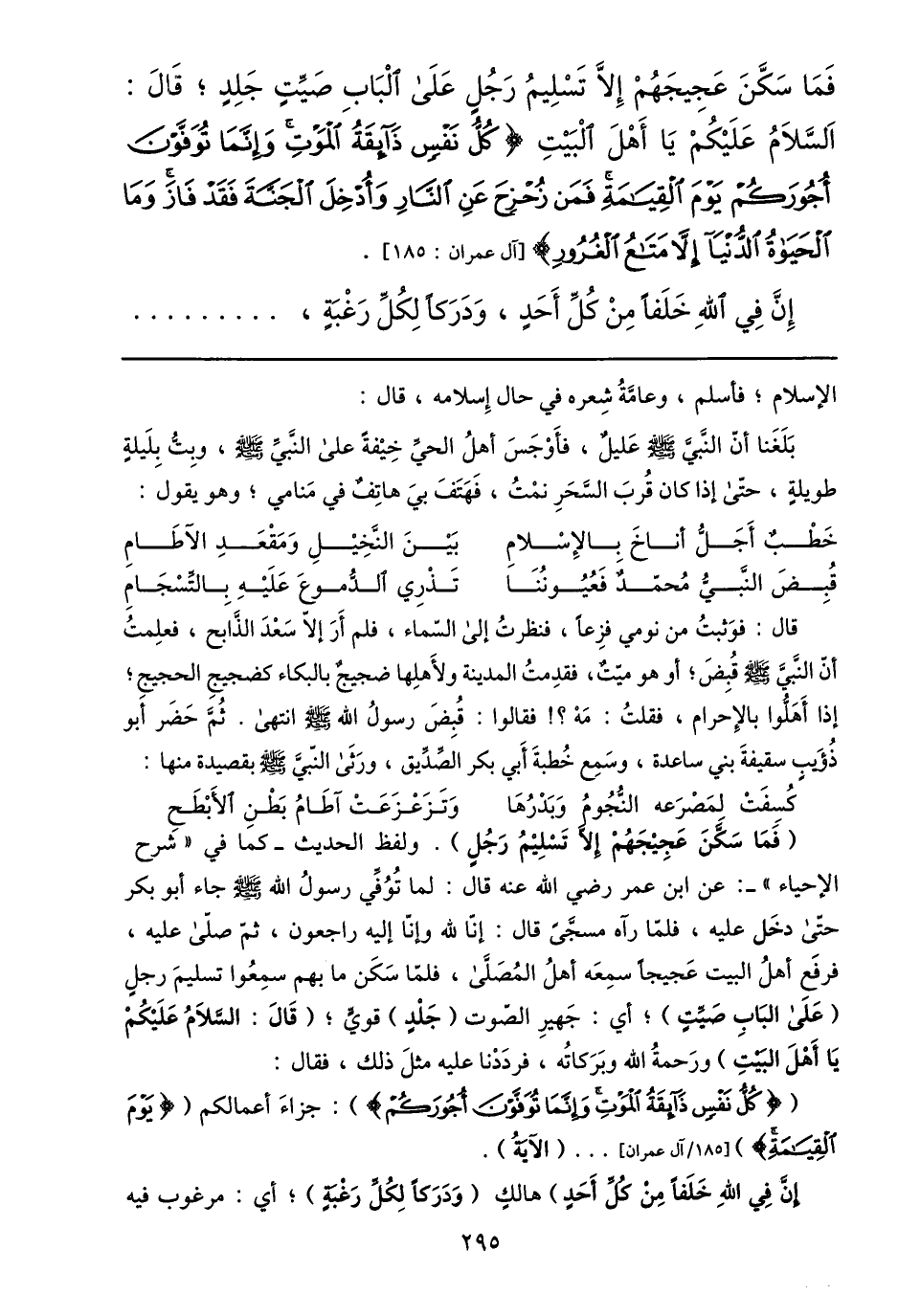 (فما سكّن عجيجهم إلّا تسليم رجل) . ولفظ الحديث- كما في «شرح الإحياء» -: عن ابن عمر رضي الله عنه قال: لما توفّي رسول الله صلى الله عليه وسلم جاء أبو بكر حتّى دخل عليه، فلمّا رآه مسجّى قال: إنّا لله وإنّا إليه راجعون، ثمّ صلّى عليه، فرفع أهل البيت عجيجا سمعه أهل المصلّى، فلمّا سكن ما بهم سمعوا تسليم رجل (على الباب صيّت) ؛ أي: جهير الصّوت (جلد) قويّ؛ (قال: السّلام عليكم يا أهل البيت) ورحمة الله وبركاته، فرددنا عليه مثل ذلك، فقال: