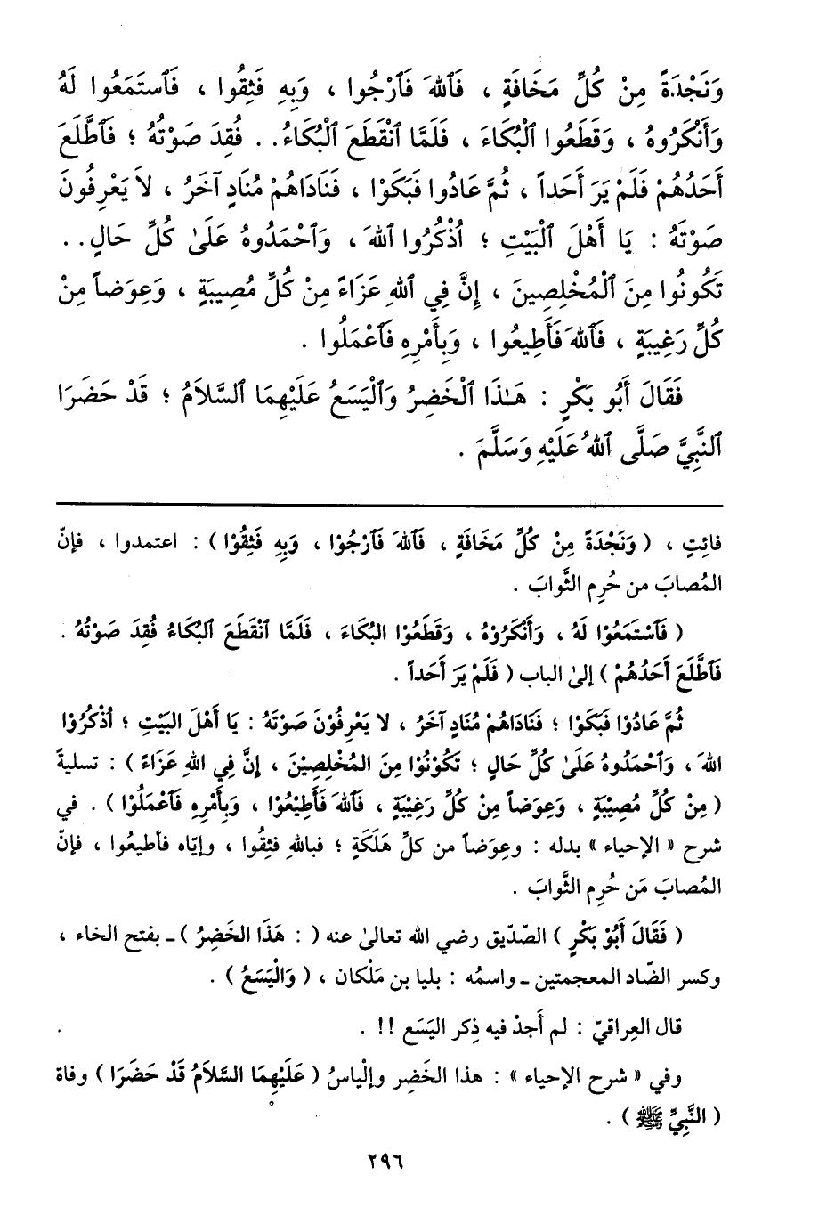 وفي «شرح الإحياء» : هذا الخضر وإلياس (عليهما السّلام قد حضرا) وفاة (النّبيّ صلى الله عليه وسلم) .
