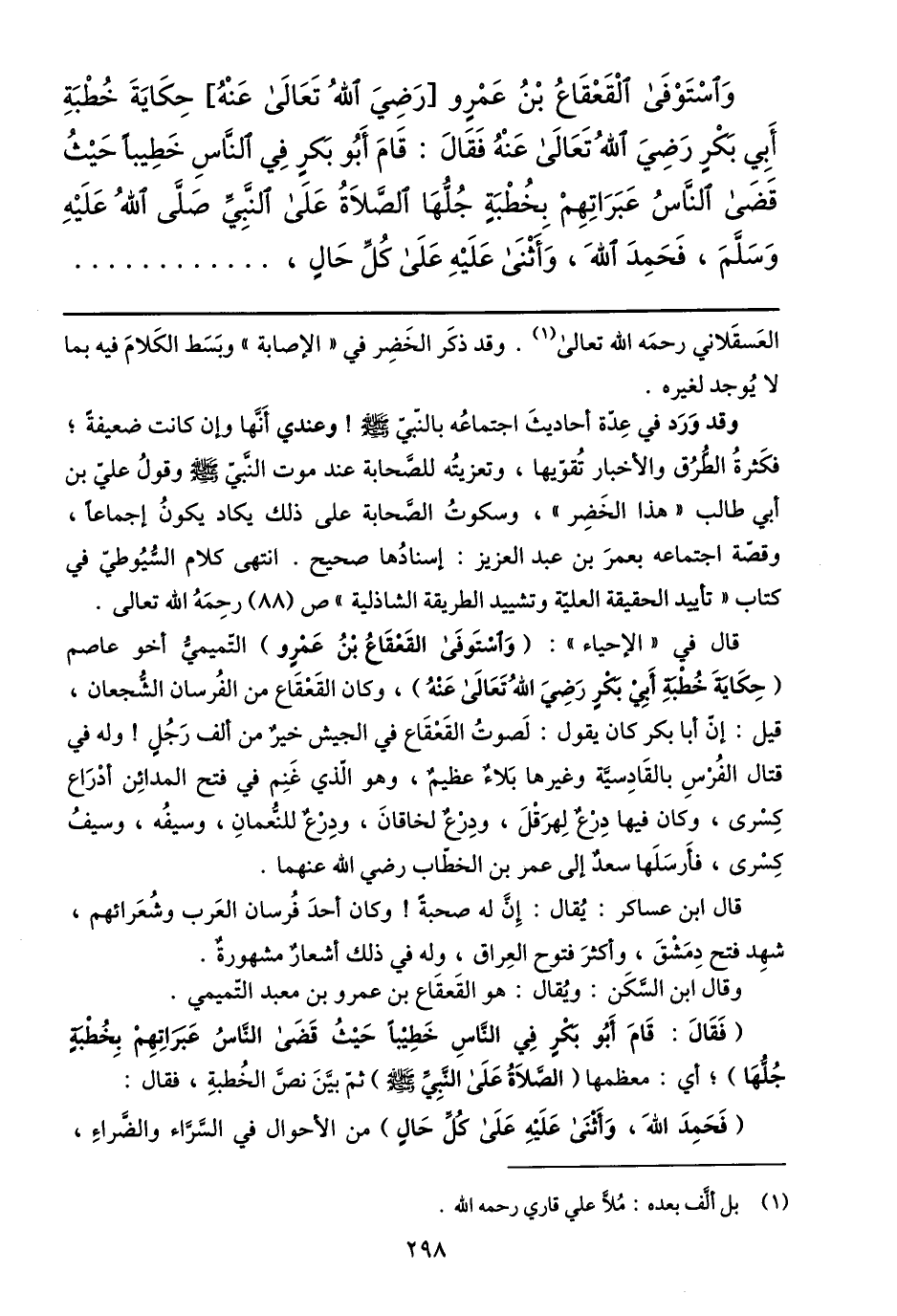 واستوفى القعقاع بن عمرو [رضي الله تعالى عنه] حكاية خطبة أبي بكر رضي الله تعالى عنه فقال: قام أبو بكر في النّاس خطيبا حيث قضى النّاس عبراتهم بخطبة جلّها الصّلاة على النّبيّ صلّى الله عليه وسلّم، فحمد الله، وأثنى عليه على كلّ حال، ...