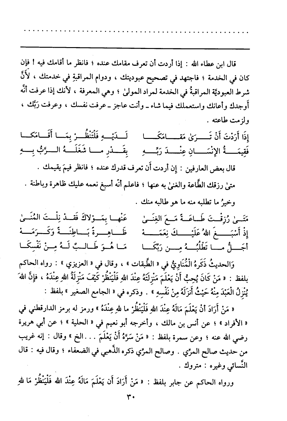 قال ابن عطاء الله: إذا أردت أن تعرف مقامك عنده؛ فانظر ما أقامك فيه! فإن كان في الخدمة؛ فاجتهد في تصحيح عبوديتك، ودوام المراقبة في خدمتك، لأنّ شرط العبوديّة المراقبة في الخدمة لمراد المولى؛ وهي المعرفة، لأنك إذا عرفت أنّه أوجدك وأعانك واستعملك فيما شاء- وأنت عاجز- عرفت نفسك، وعرفت ربّك، ولزمت طاعته.