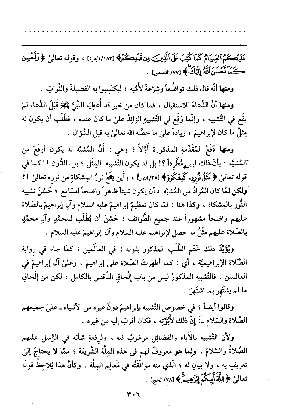 ولكن لمّا كان المراد من المشبّه به أن يكون شيئا ظاهرا واضحا للسّامع؛ حسن تشبيه النّور بالمشكاة، وكذا هنا: لمّا كان تعظيم إبراهيم عليه السلام وآل إبراهيم بالصّلاة عليهم واضحا مشهورا عند جميع الطّوائف؛ حسن أن يطلب لمحمّد وآل محمّد بالصّلاة عليهم مثل ما حصل لإبراهيم عليه السلام وآل إبراهيم عليه السلام.