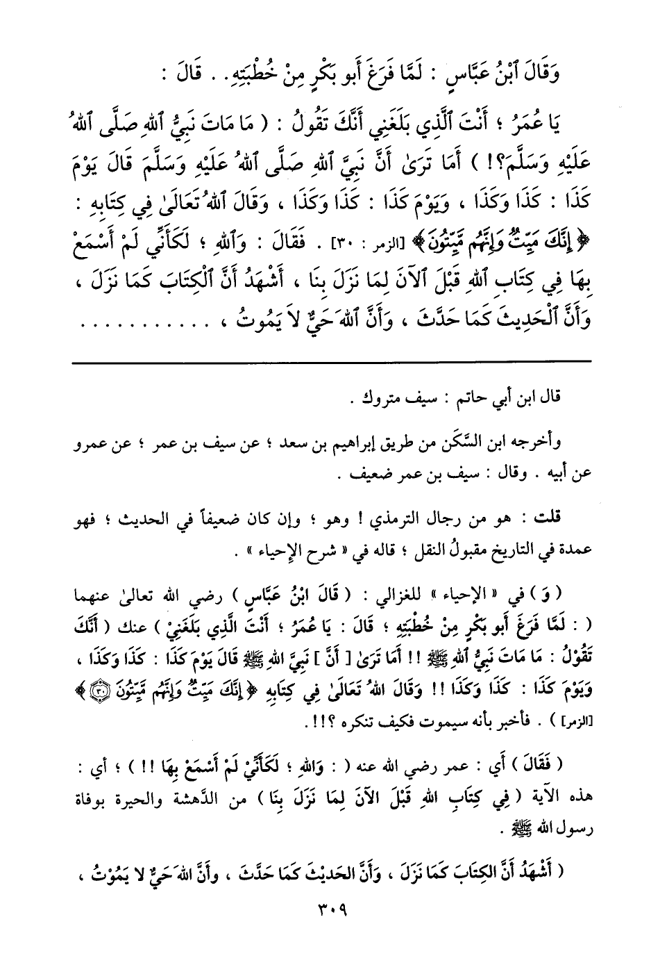 (و) في «الإحياء» للغزالي: (قال ابن عبّاس) رضي الله تعالى عنهما (: لمّا فرغ أبو بكر من خطبته؛ قال: يا عمر؛ أنت الّذي بلغني) عنك (أنّك تقول: ما مات نبيّ الله صلى الله عليه وسلم!! أما ترى [أنّ] نبيّ الله صلى الله عليه وسلم قال يوم كذا: كذا وكذا، ويوم كذا: كذا وكذا!! وقال الله تعالى في كتابه إِنَّكَ مَيِّتٌ وَإِنَّهُمْ مَيِّتُونَ (30) [الزمر] ) . فأخبر بأنه سيموت فكيف تنكره؟!!.