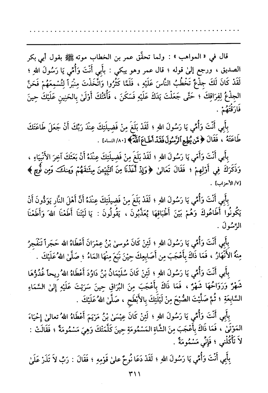 بأبي أنت وأمّي يا رسول الله؛ لقد بلغ من فضيلتك عنده أنّ أهل النّار يودّون أن يكونوا أطاعوك وهم بين أطباقها يعذّبون، يقولون: يا ليتنا أطعنا الله وأطعنا الرّسول.