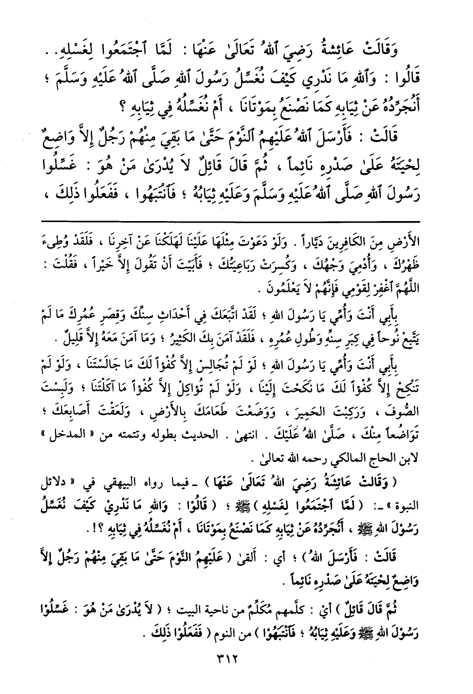 قالت: فأرسل الله عليهم النّوم حتّى ما بقي منهم رجل إلّا واضع لحيته على صدره نائما، ثمّ قال قائل لا يدرى من هو: غسّلوا رسول الله صلّى الله عليه وسلّم وعليه ثيابه؛ فانتبهوا، ففعلوا ذلك، الأرض من الكافرين ديّارا. ولو دعوت مثلها علينا لهلكنا عن آخرنا، فلقد وطئ ظهرك، وأدمي وجهك، وكسرت رباعيتك؛ فأبيت أن تقول إلّا خيرا، فقلت: