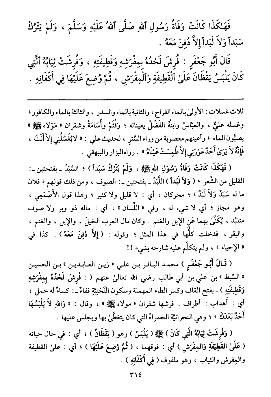 (قال أبو جعفر) محمد الباقر بن علي «زين العابدين» بن الحسين «السّبط» بن علي بن أبي طالب رضي الله تعالى عنهم (: فرش لحده بمفرشه وقطيفته) - بفتح القاف وكسر الطاء المهملة وسكون التّحتيّة ففاء-: كساء له خمل؛ أي: أهداب: أطراف. فرشها شقران «مولاه صلى الله عليه وسلم» ، وقال: «والله لا يلبسها أحد بعدك» ؛ وهي النجرانيّة الحمراء التي كان يتغطّى بها ويجلس عليها.