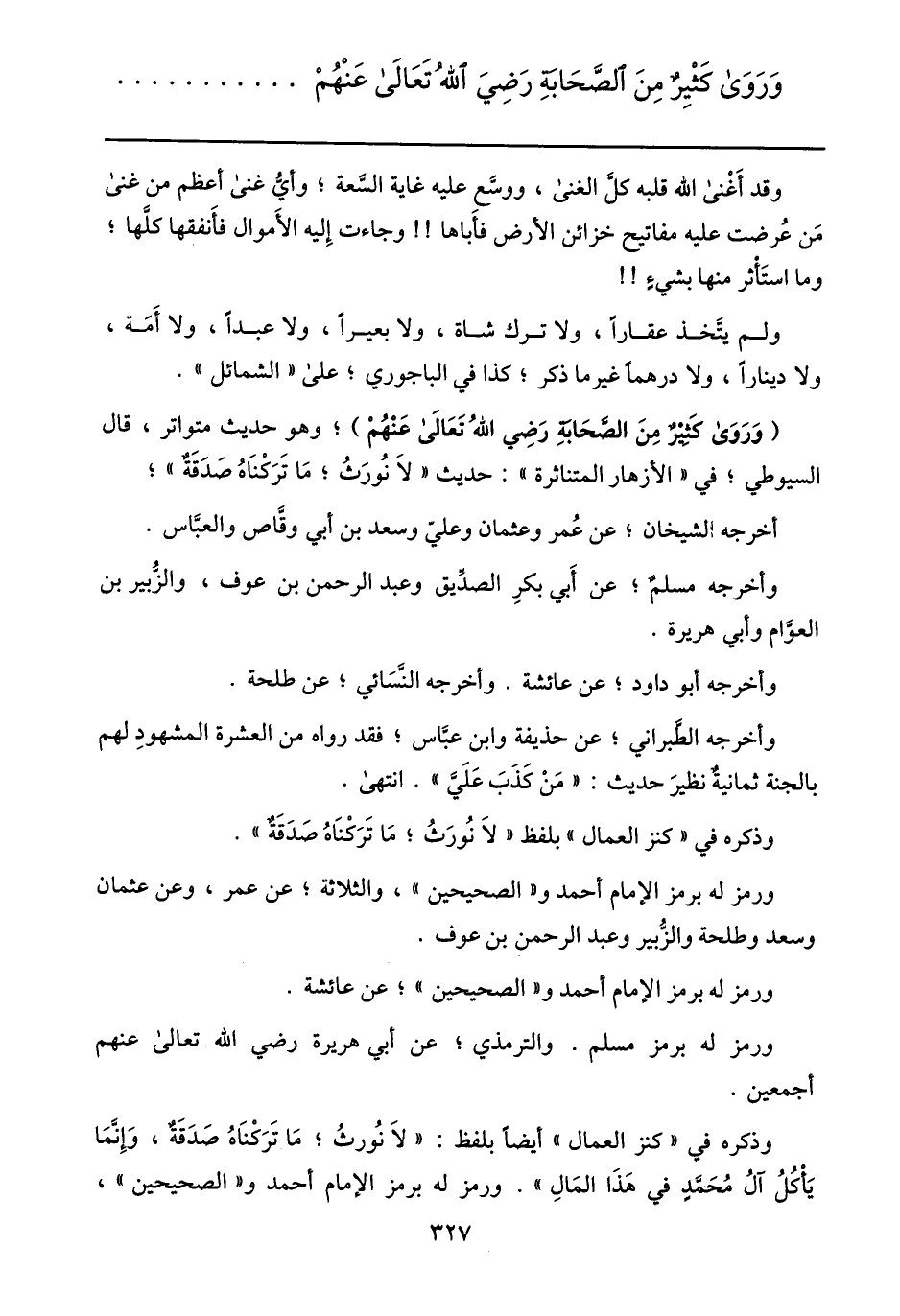 (وروى كثير من الصّحابة رضي الله تعالى عنهم) ؛ وهو حديث متواتر، قال السيوطي؛ في «الأزهار المتناثرة» : حديث «لا نورث؛ ما تركناه صدقة» ؛