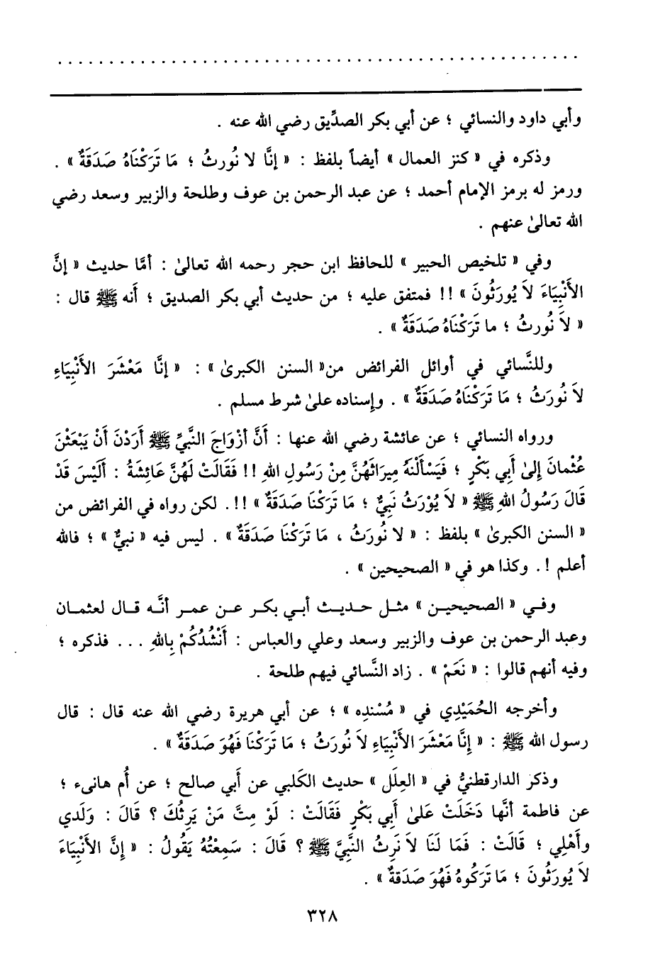 وفي «تلخيص الحبير» للحافظ ابن حجر رحمه الله تعالى: أمّا حديث «إنّ الأنبياء لا يورثون» !! فمتفق عليه؛ من حديث أبي بكر الصديق؛ أنه صلى الله عليه وسلم قال: