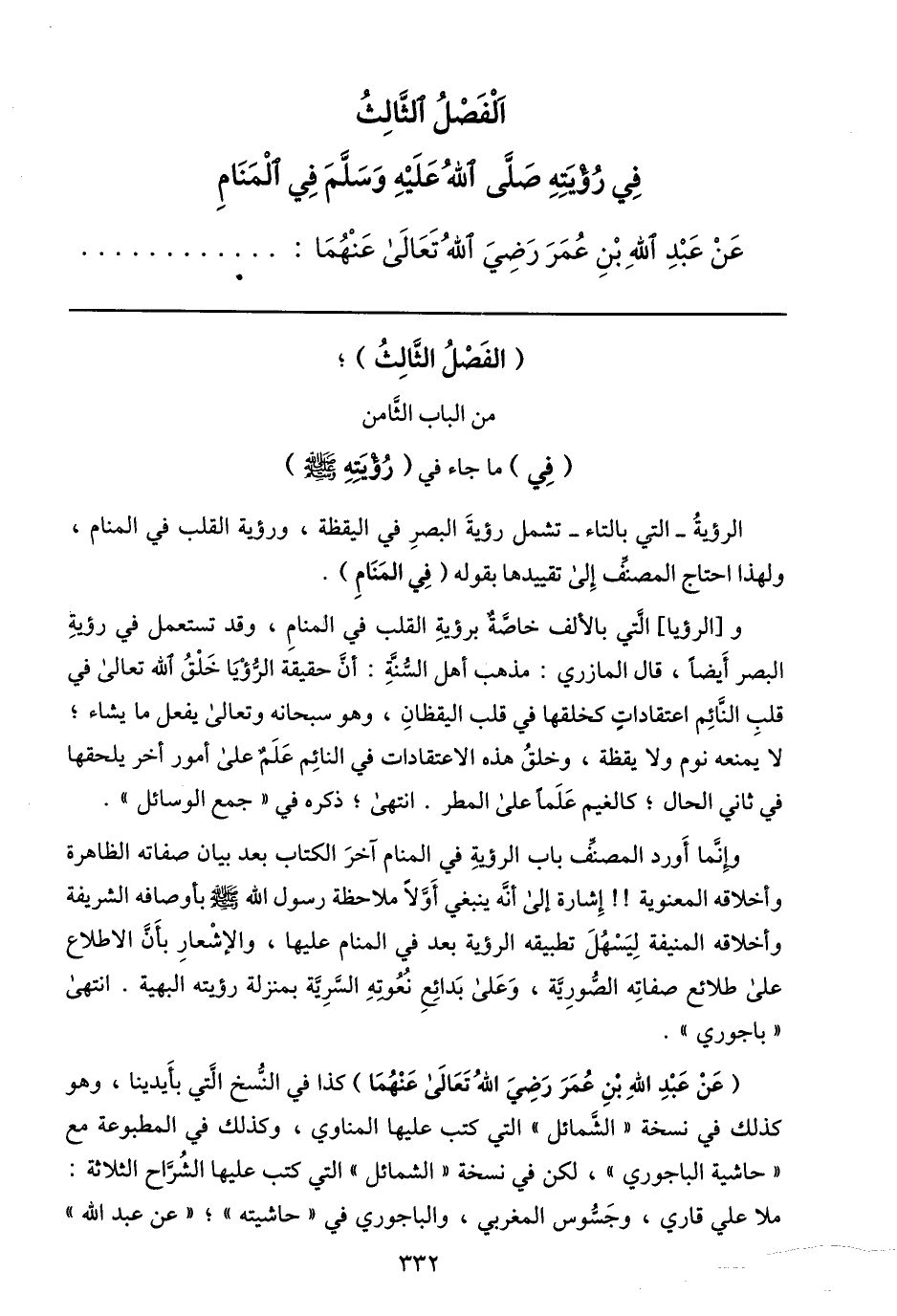 وإنّما أورد المصنّف باب الرؤية في المنام آخر الكتاب بعد بيان صفاته الظاهرة وأخلاقه المعنوية!! إشارة إلى أنّه ينبغي أوّلا ملاحظة رسول الله صلى الله عليه وسلم بأوصافه الشريفة وأخلاقه المنيفة ليسهل تطبيقه الرؤية بعد في المنام عليها، والإشعار بأنّ الاطلاع على طلائع صفاته الصّوريّة، وعلى بدائع نعوته السّريّة بمنزلة رؤيته البهية. انتهى «باجوري» .