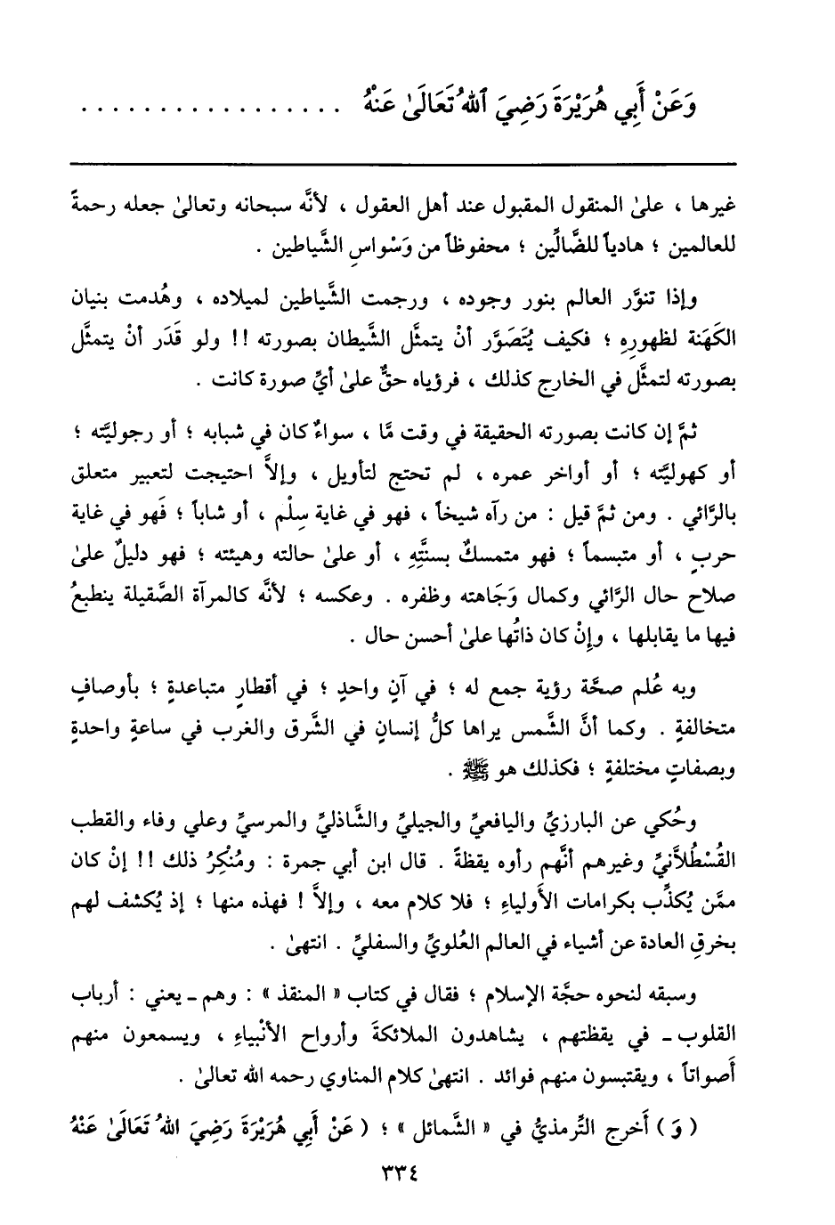 وبه علم صحّة رؤية جمع له؛ في آن واحد؛ في أقطار متباعدة؛ بأوصاف متخالفة. وكما أنّ الشّمس يراها كلّ إنسان في الشّرق والغرب في ساعة واحدة وبصفات مختلفة؛ فكذلك هو صلّى الله عليه وسلّم.