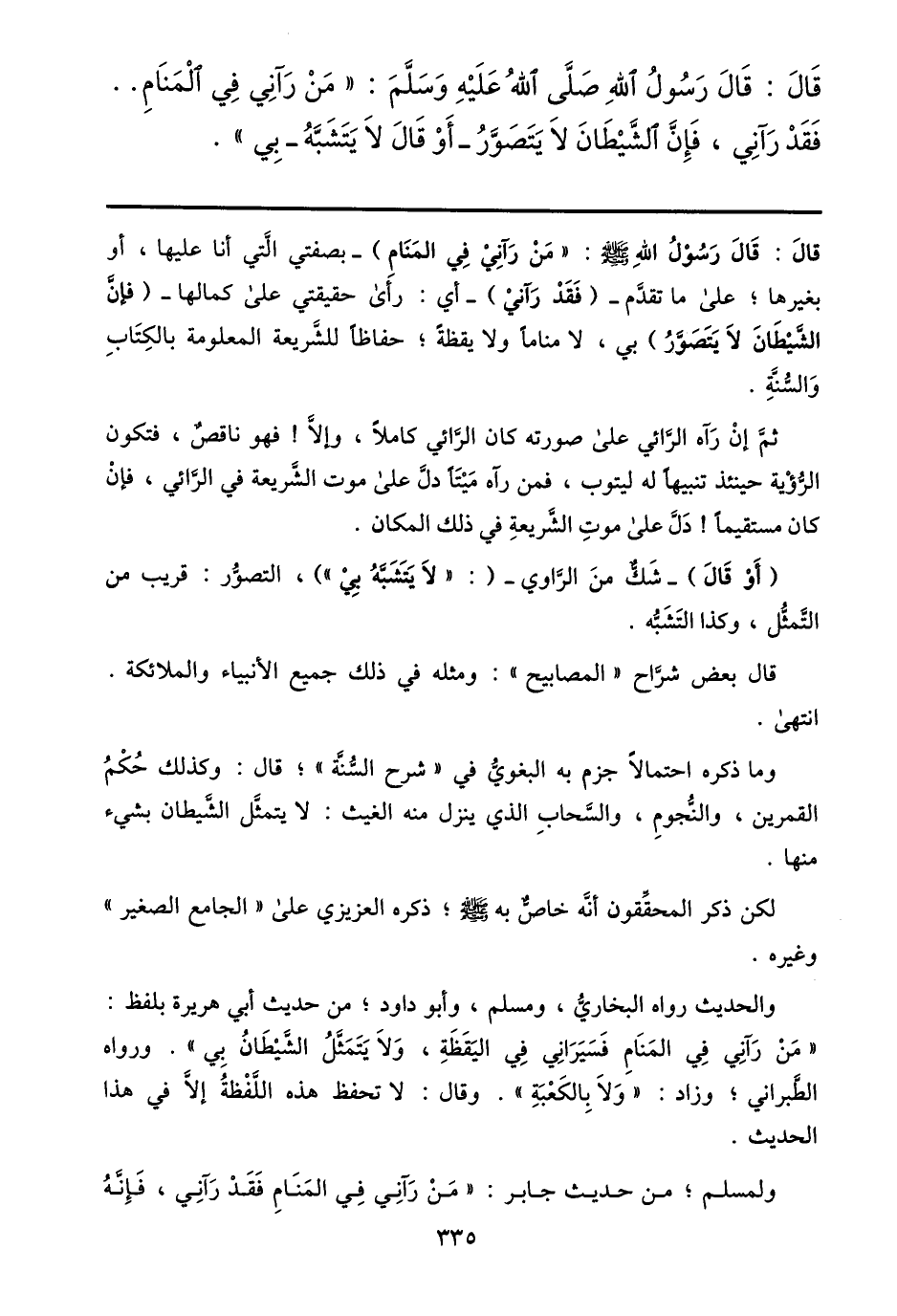 فقد رآني، فإنّ الشّيطان لا يتصوّر- أو قال لا يتشبّه- بي» .