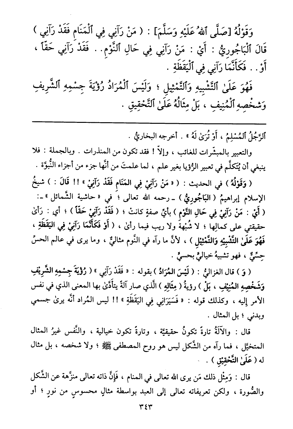 وقوله [صلّى الله عليه وسلّم] : (من رآني في المنام فقد رآني) قال الباجوريّ: أي: من رآني في حال النّوم.. فقد رآني حقّا، أو.. فكأنّما رآني في اليقظة.