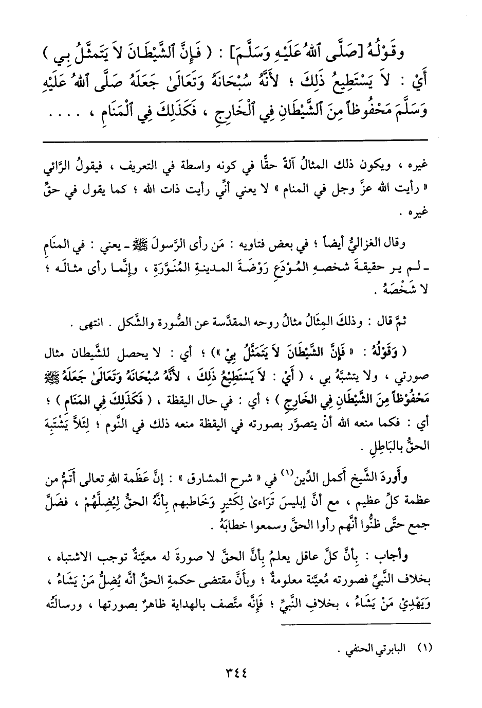 وأجاب: بأنّ كلّ عاقل يعلم بأنّ الحقّ لا صورة له معيّنة توجب الاشتباه، بخلاف النّبيّ فصورته معيّنة معلومة؛ وبأنّ مقتضى حكمة الحقّ أنّه يضلّ من يشاء، ويهدي من يشاء، بخلاف النّبيّ؛ فإنّه متّصف بالهداية ظاهر بصورتها، ورسالته