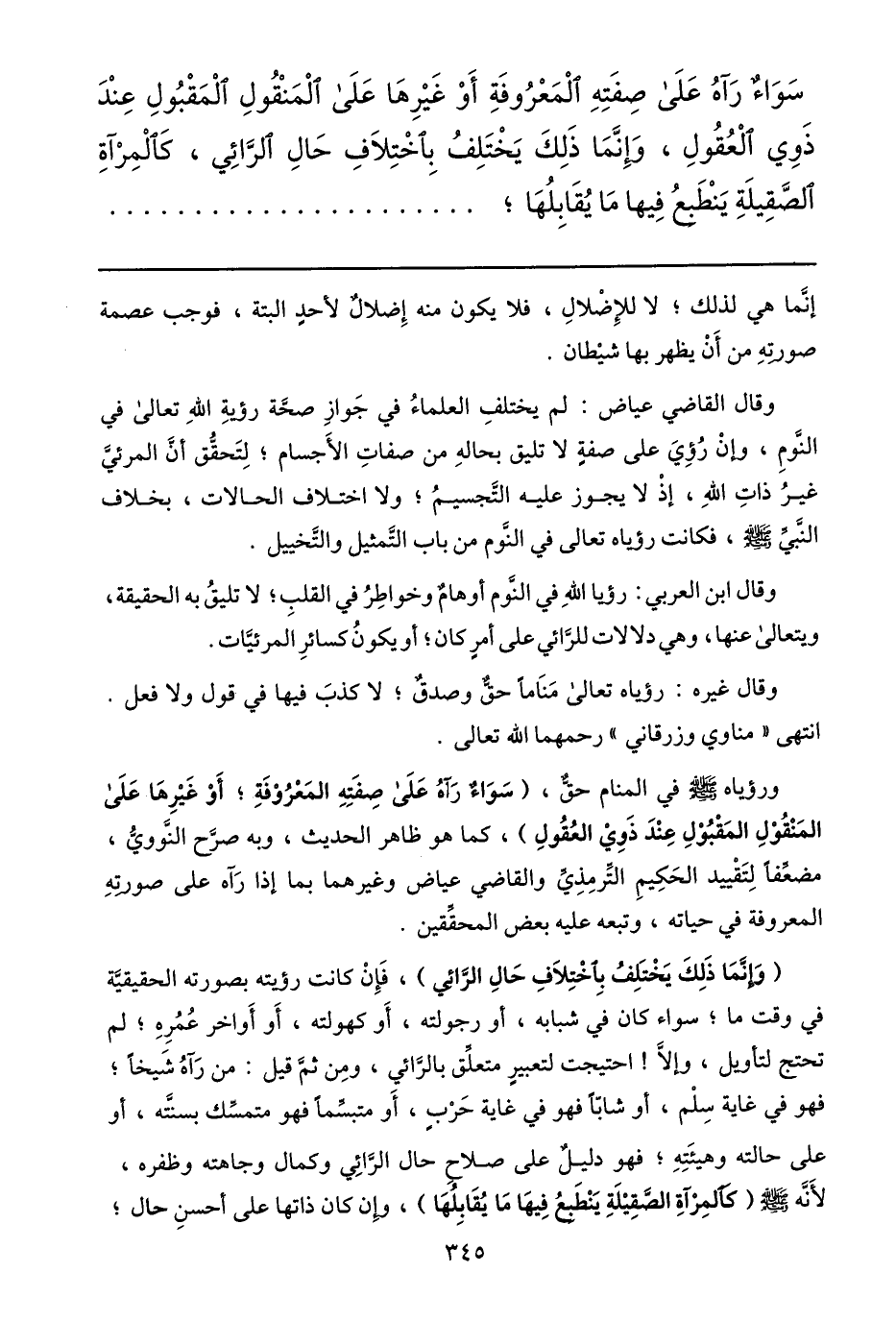 ورؤياه صلى الله عليه وسلم في المنام حقّ، (سواء رآه على صفته المعروفة؛ أو غيرها على المنقول المقبول عند ذوي العقول) ، كما هو ظاهر الحديث، وبه صرّح النّوويّ، مضعّفا لتقييد الحكيم التّرمذيّ والقاضي عياض وغيرهما بما إذا رآه على صورته المعروفة في حياته، وتبعه عليه بعض المحقّقين.