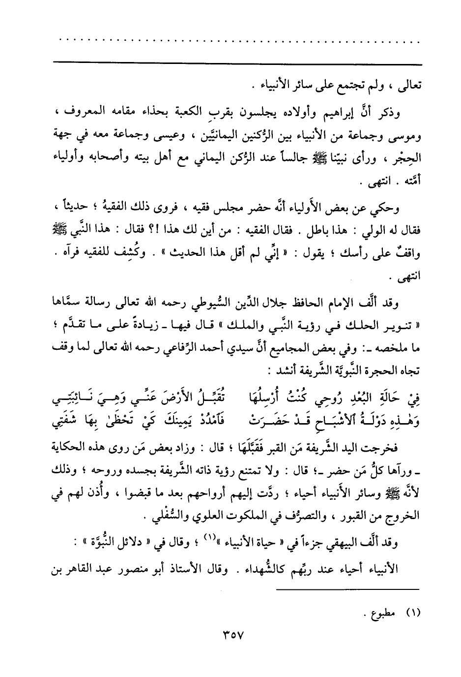 فخرجت اليد الشّريفة من القبر فقبّلها؛ قال: وزاد بعض من روى هذه الحكاية ورآها كلّ من حضر-؛ قال: ولا تمتنع رؤية ذاته الشّريفة بجسده وروحه؛ وذلك لأنّه صلى الله عليه وسلم وسائر الأنبياء أحياء؛ ردّت إليهم أرواحهم بعد ما قبضوا، وأذن لهم في الخروج من القبور، والتصرّف في الملكوت العلوي والسّفلي.